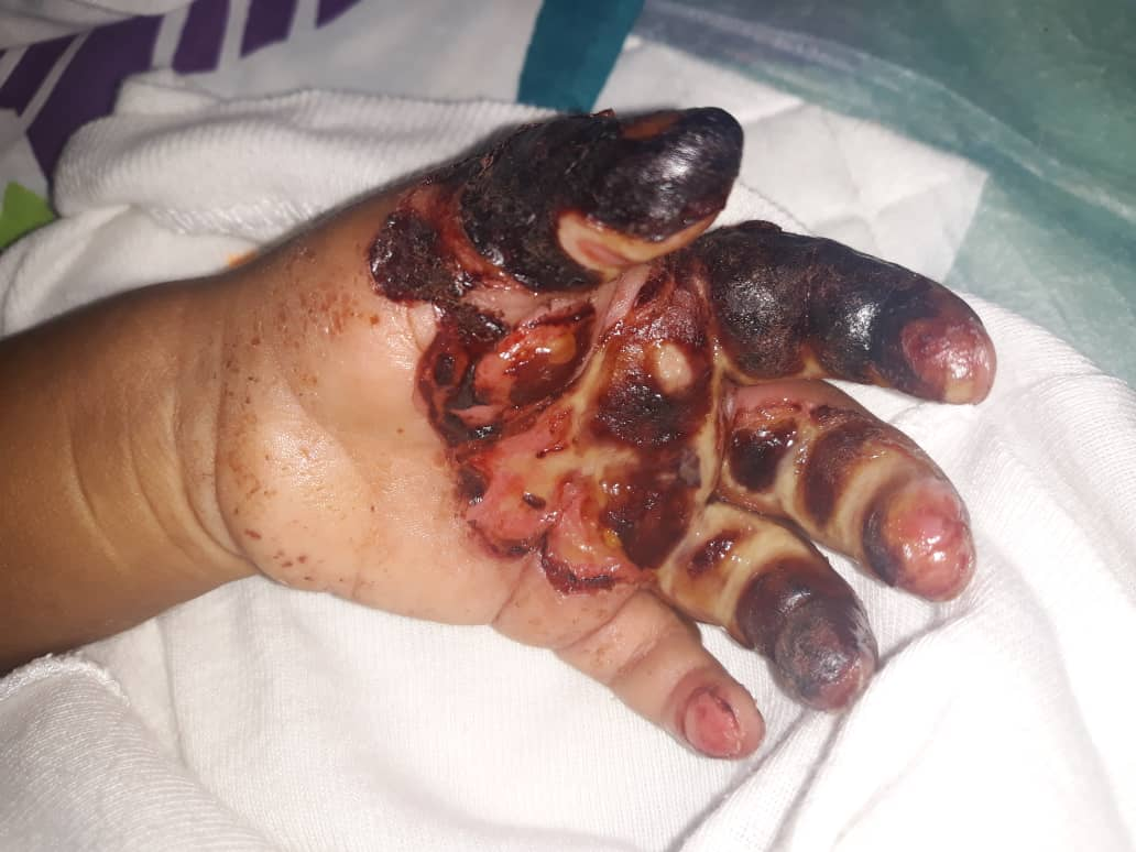 Su pequeña mano le dolía al moverla, toda la piel era oscura, casi negra, Cinthia no quería que la tocaran, no quería comer, le dolía mucho.