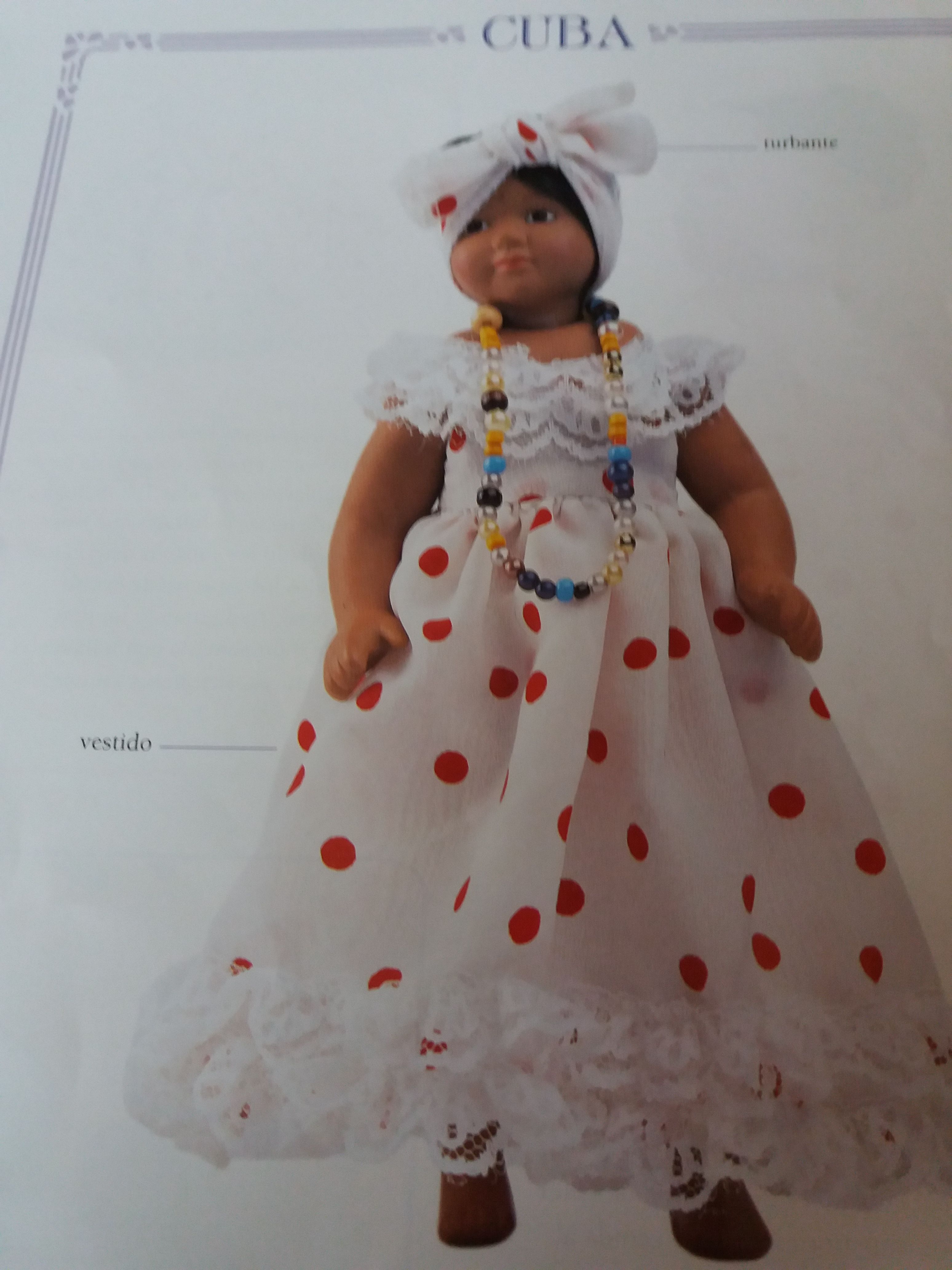En esta ocasion la muñeca que os presento lleva la indumentaria típica femenina de Cuba, es el resultado de un complejo mosaico étnico y cultural en el que las influencias de los hispanos, africanos, chinos y antillanos, determinan todos los aspectos de la vida social y también su vestido .