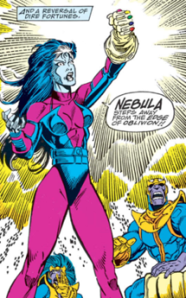 Al enfrentarse con Thanos este casi la mato usando las “gemas del infinito” dejándola completamente desfigurada como un “Zombi”. Debatiéndose entre la vida y la muerte Nebula logra robar el Guantele y con su poder recuperar todo su cuerpo en busca de venganza contra el Titán y seguir sus planes de tomar el control del universo.