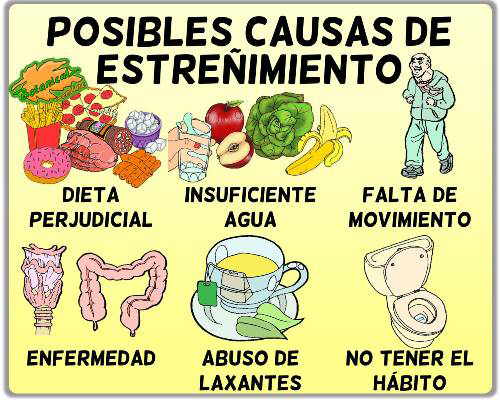 Sus causas son variadisimas, la mas frecuentes es debido a la deficiencia o desequilibrio del règimen alimenticio. Pobres en celulosas ( ensaladas, verduras, y frutas ); comer de prisa y de forma irregular, e inestabilidad de horarios, concentraciòn de la comida mas sustanciosas por la noche, insuficiencia de agua, falta de ejercicios, tension emocional; lesiones dolorosas del ano, como fìstulas y hemorroides etc. Todo lo cual produce una alteraciòn funcional de la movilidad del colòn encargado de contraerse y expulsar elcntenido del mismo hacia el recto, en donde se produce la necesidad de evacuar.