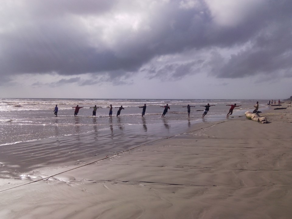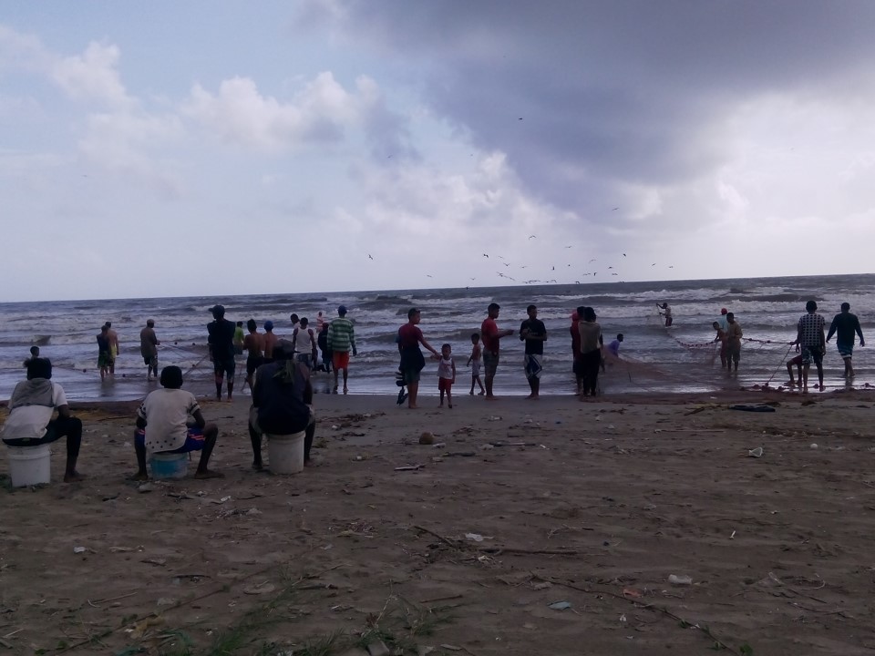 Señalando un pequeño bote, me dice que allí montan el chinchorro y antes de partir mar adentro amarran una punta en la orilla y se van un grupo de pescadores en el bote estirando la red en forma de la letra U (que es la forma como se guinda un chinchorro en Venezuela), según el tamaño de ella (ésta en este caso medía 1500 metros de largo), por todo el espacio que planificaron arrastrar las especies marinas, después de un cierto trayecto el grupo de pescadores se lanzan al mar con la otra punta, quedando en el bote solo un pescador para maniobrar dicho bote y controlar el extremo de esa red que cuenta con una boya grande.