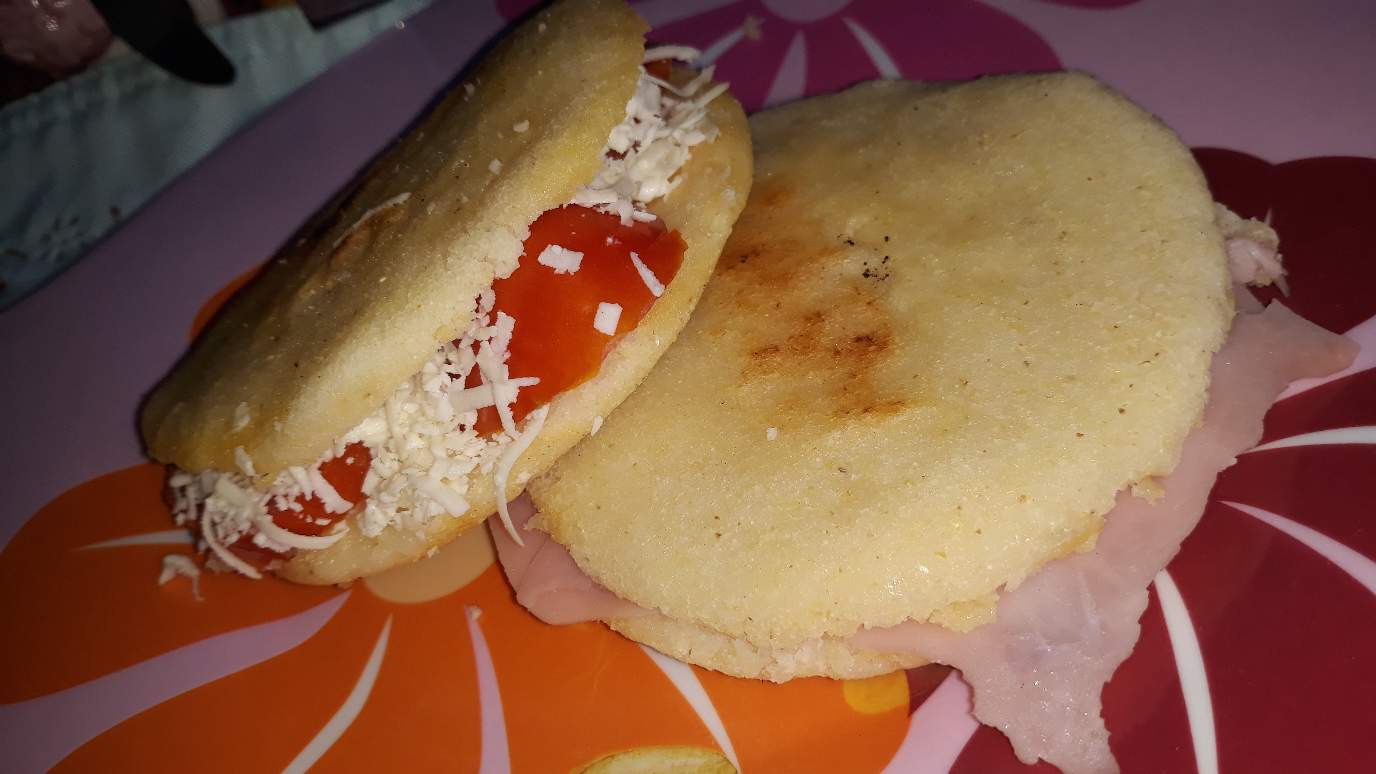 Primero que nada feliz inicio de Mes, hoy mi pareja y yo preparamos el desayuno y bueno a mi me provocó comerme una de las arepas con queso blanco (Santa Bárbara) y unas cuantas rodajas de tomate, la otra arepa fue más sencilla pero deliciosa, acompañada de un poco de Rikesa y jamón de pierna.