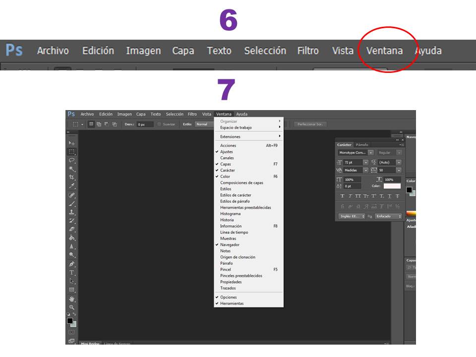 Observa la imagen y revisa que las opciones: "Ajustes" , "Capas", " Carácter", "Color", "Navegador", "Opciones", "Herramientas", estén marcadas.