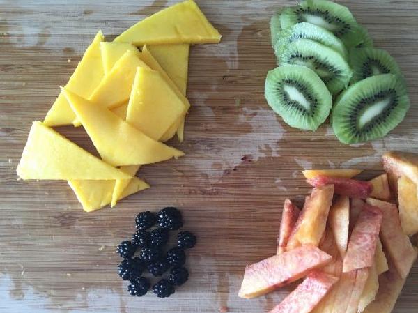 • Se pelan las frutas y se pican de la siguiente manera: el mango en forma de triangulo, el kiwi en rodajas, y el melocotón en formas irregulares.