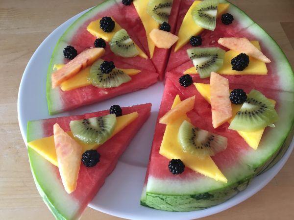 Debemos tomar en cuenta que cuando cocinamos para niños siempre es recomendable que los platillos sean bastantes divertidos y que a la vez cumplan con los niveles nutricionales que ellos requieren. En esta ocasión quiero mostrarles un delicioso postre que los dejará enamorados. El procedimiento es bastante sencillo sólo vamos a tratar de imitar los ingredientes de una pizza tradicional por diferentes tipos de frutas. Para eso vamos a combinar la patilla, el kiwi, el mango, el melocotón, y las moras. Imaginándonos que la patilla será la masa ya con su salsa, el mango será el queso, el melocotón el jamón, el kiwi el pimentón, y las moras serían las aceitunas.