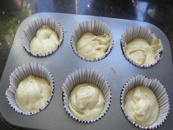 • Después en una bandeja para ponquesitos se le introducen los moldes de papel que son resistentes al horno y se llenan hasta la mitad ya que aumentaran de volumen durante su cocción. Luego se llevan al horno previamente precalentado a 180 grados por aproximadamente 40 minutos.