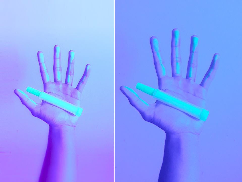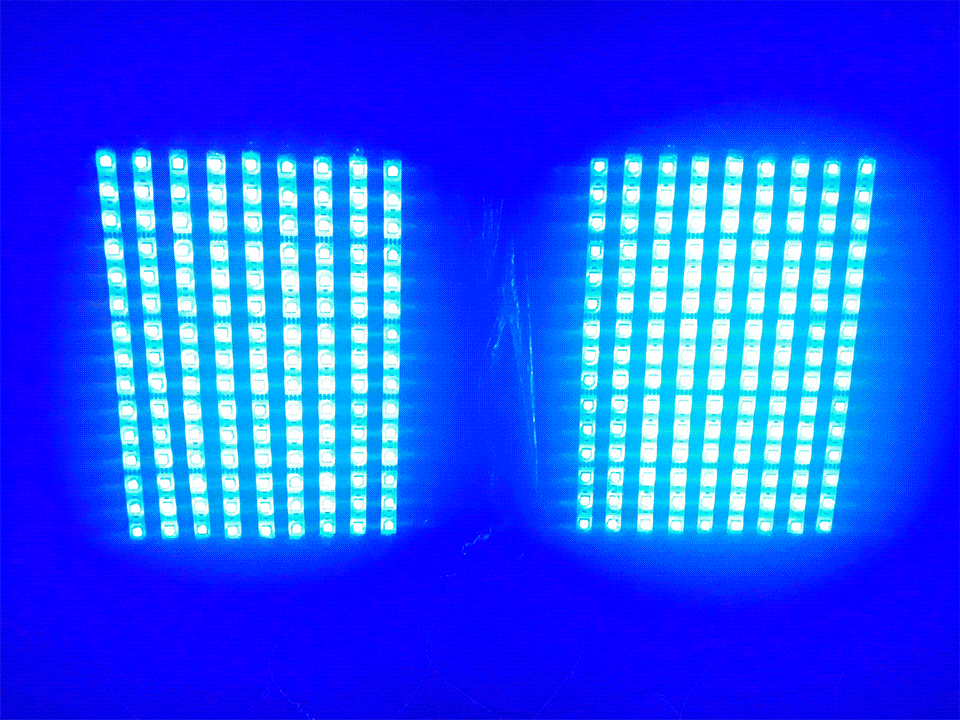 O si te lo puedes permitir puedes usar Tiras LED para formar tus paneles de Luz UV, los cortas y los pegas en líneas sobre una lámina dura y ya está, en mi caso tenia 2 en casa, la luz azul pura ya de por sí es muy potente y da el efecto que necesitamos pero si quieres filtrar aún más la luz y que solamente resalta el efecto ultra violeta puedes filtrar aún más la luz con una capa de marcador rojo o morado y una de azul sobre cinta adhesiva.