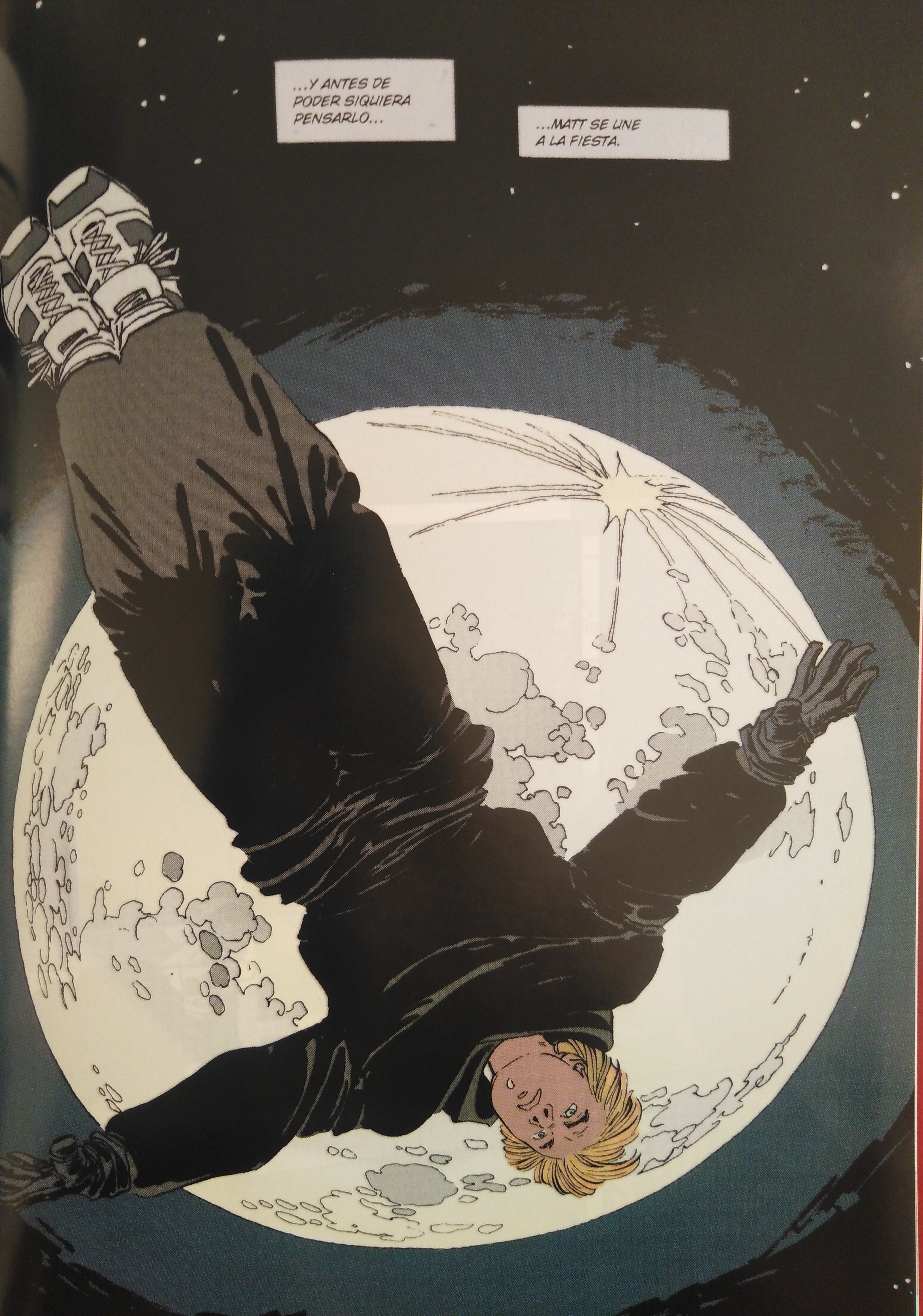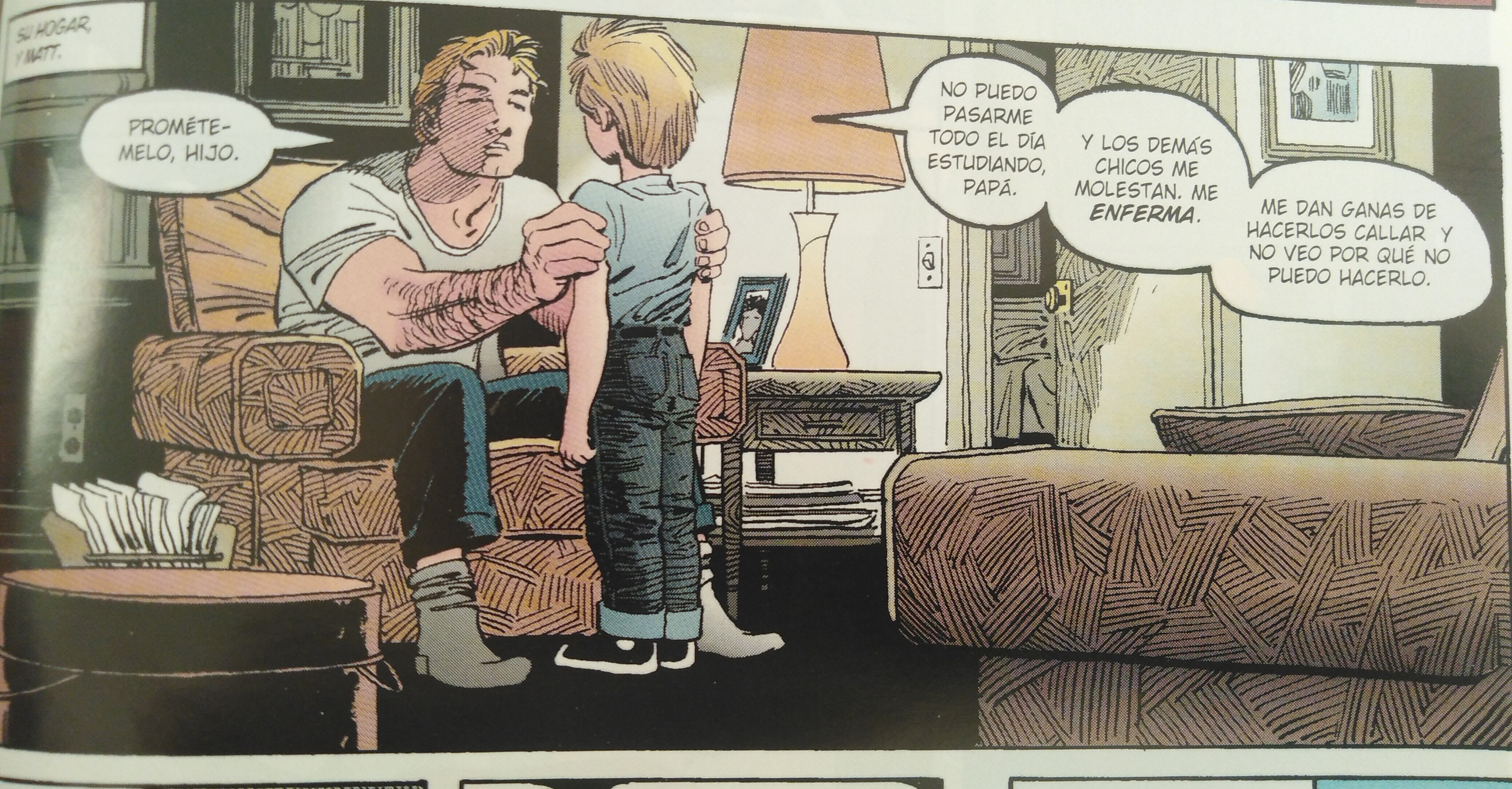 Lo que quizás al inicio me resulta algo extraño es el estilo narrativo, aquí no predomina la historia llevada por los diálogos entre los personajes que participan, aquí está muy marcada por la tercera persona y le da más ese sentir de que alguien más no está contando la historia sobre cómo sucedió todo esto en la vida de Daredevil.