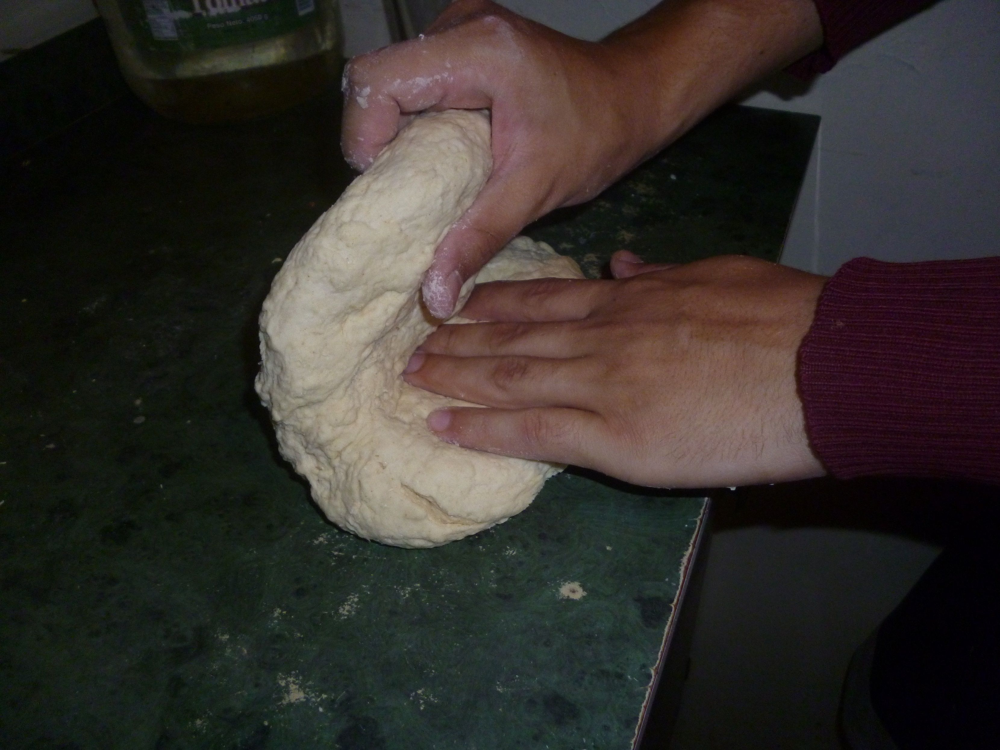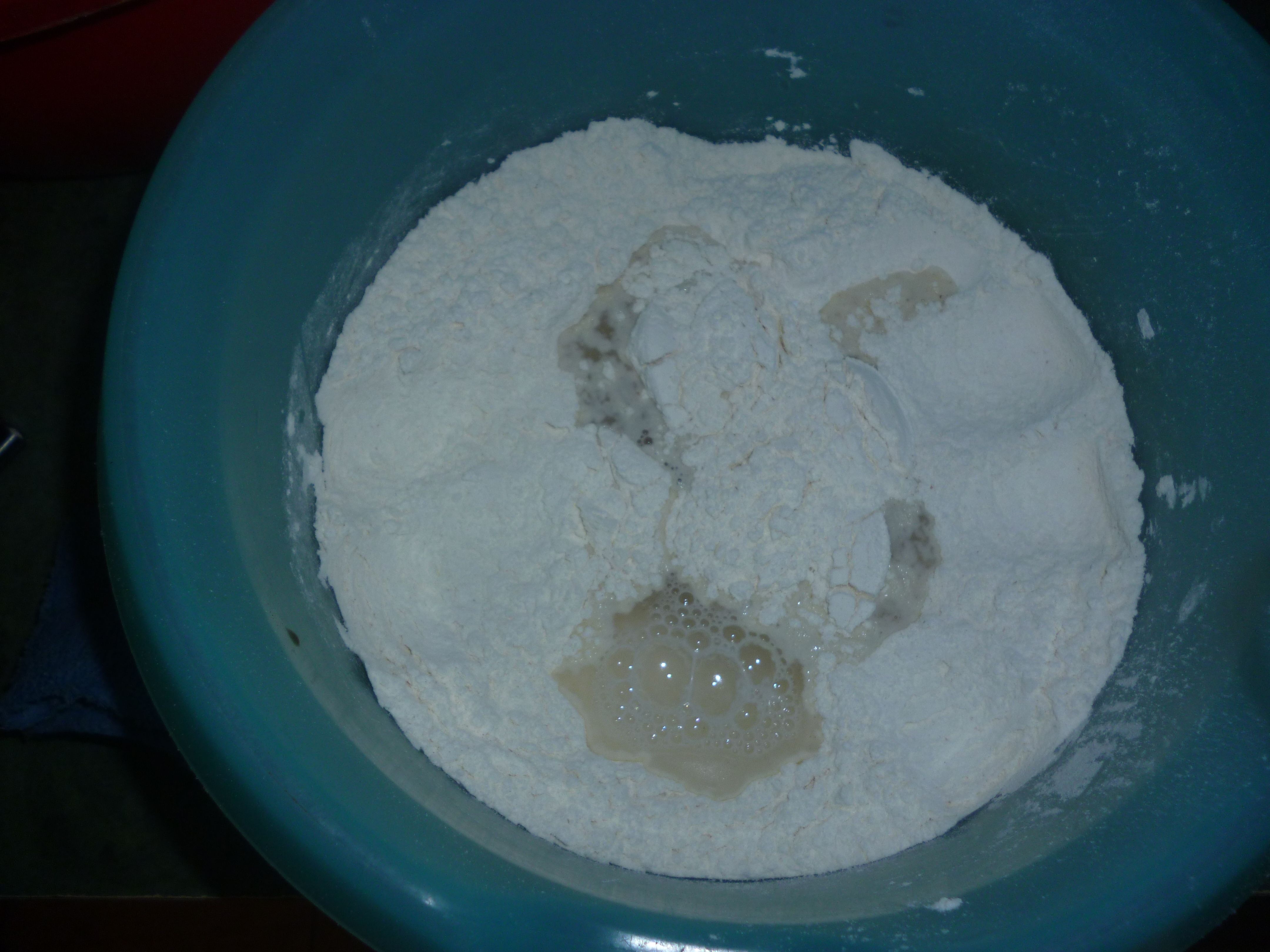 - Coloca la harina en un bowl, hazle un agujero en el centro y alli deposita el aceite, la sal y la preparacion anterior de levadura, agua y azucar.