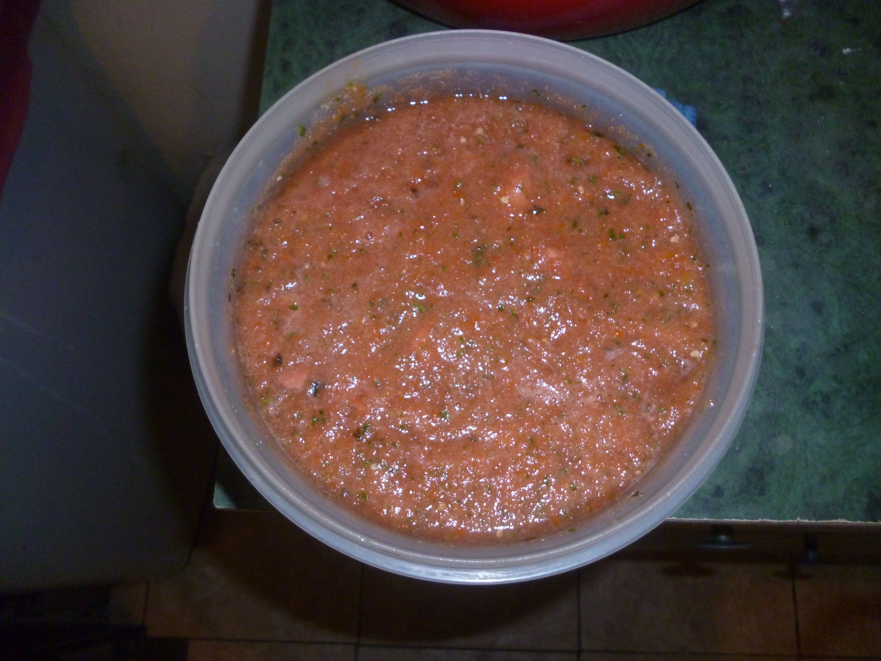 - Trocea el tomate, la cebolla y los ajos, (Yo le pongo aji y pimenton y cebollin, pero esto es a gusto de la persona) colocalos en una licuadora junto con la sal, la pimienta, el azucar y una parte del agua, licua bien todo.