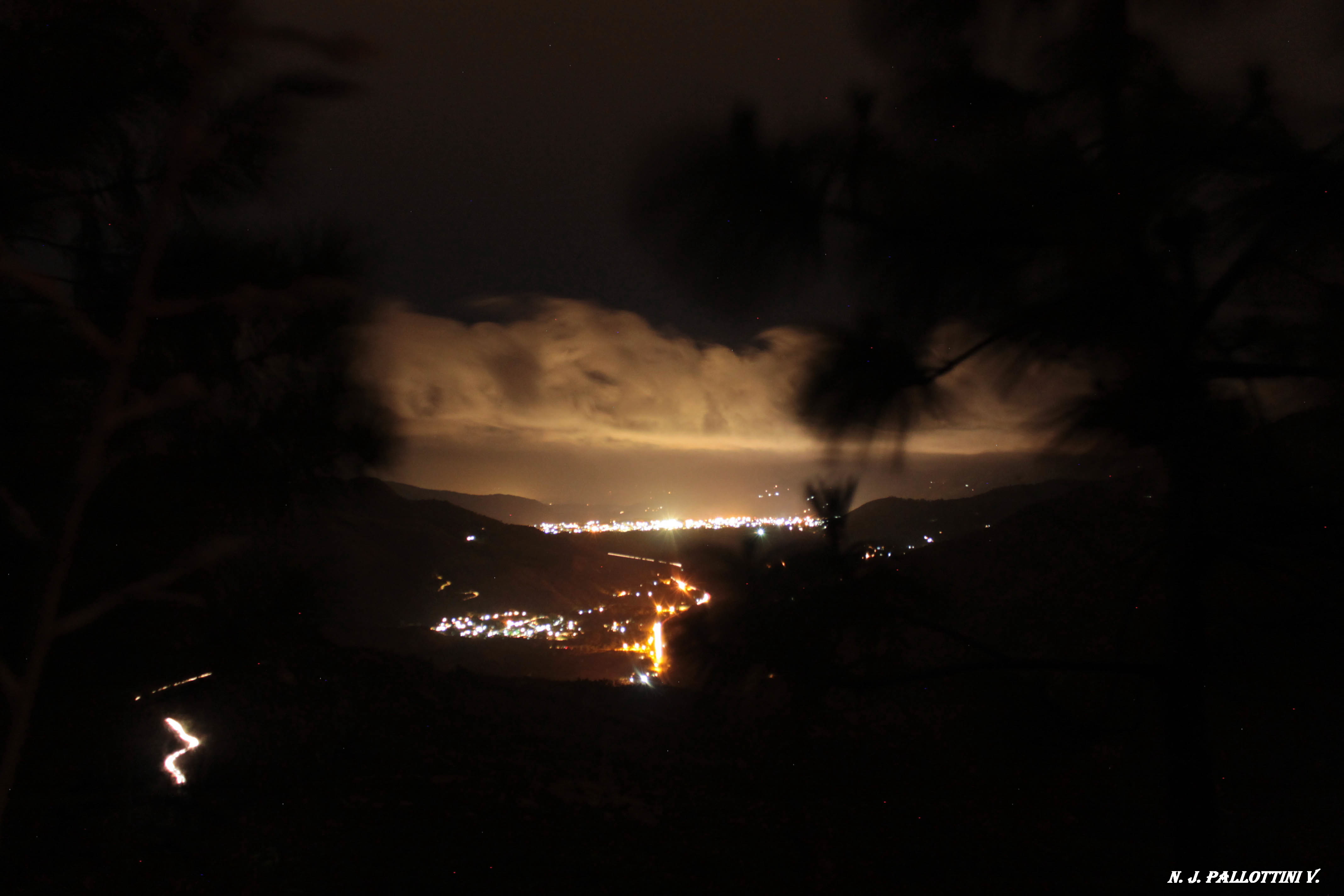 Vista nocturna desde el Cerro Cabeza de Vaca de la población de San Pedro del Río, al fondo San Juan de Colón y el cielo del Lago de Maracaibo.