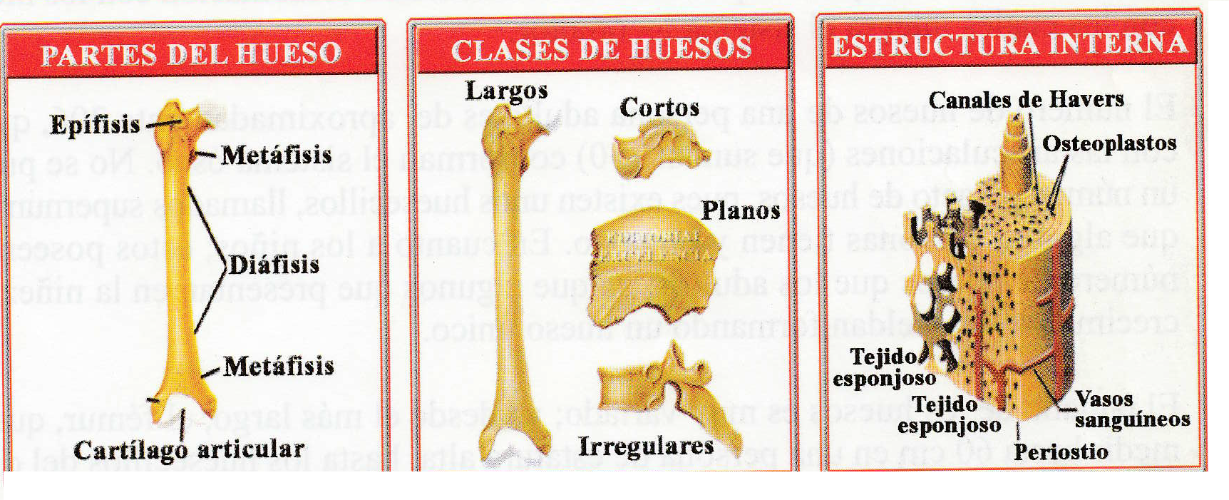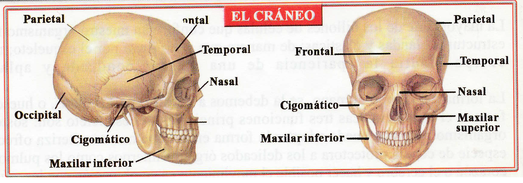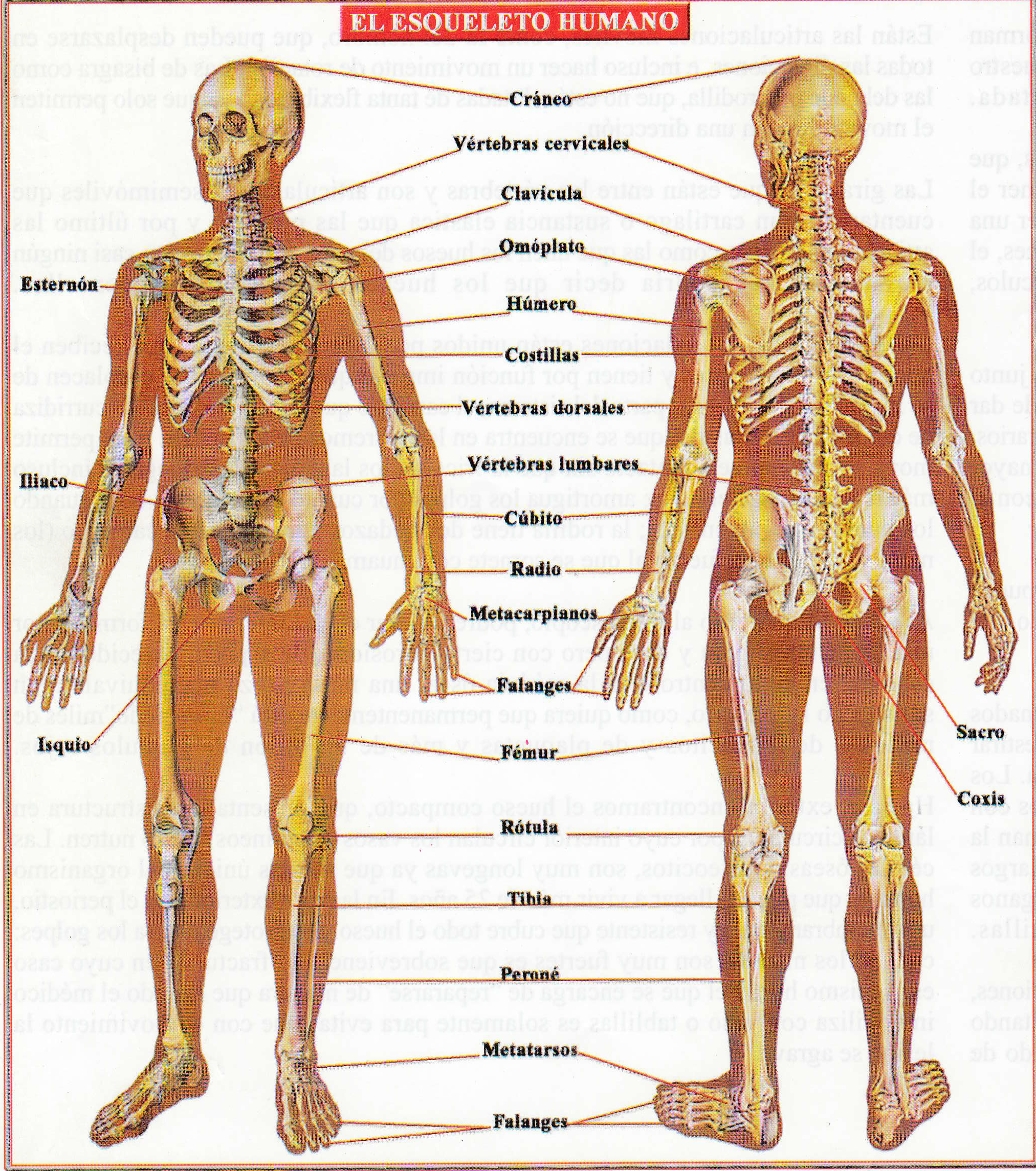 La forma del cuerpo humano, se la debemos a nuestras partes duras, o huesos, que forman el esqueleto. Las tres funciones principales del esqueleto son : sostener el organismo para que pueda adoptar la forma erecta que nos caracteriza, ofrecer una especie de coraza protectora a los delicados órganos internos como los pulmones, el corazón o el cerebro y hacer posible el movimiento en combinación con los músculos, con los cuales integra el sistema locomotor.