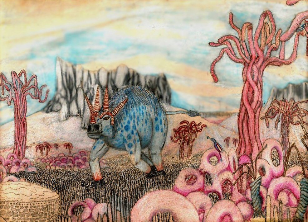 En las imágenes inferiores podemos ver algunos representantes de la fauna originaria de Laurencia. Debajo de estas líneas podemos ver un Tetraclunis variegata y más abajo vemos un Ceriterium xaprasttensis acompañado del famoso “Pájaro trompeta” (Aviclinus tromboeleptis) Este pequeño pájaro se puede observar posado en una planta a la derecha de la gigantesca bestia.