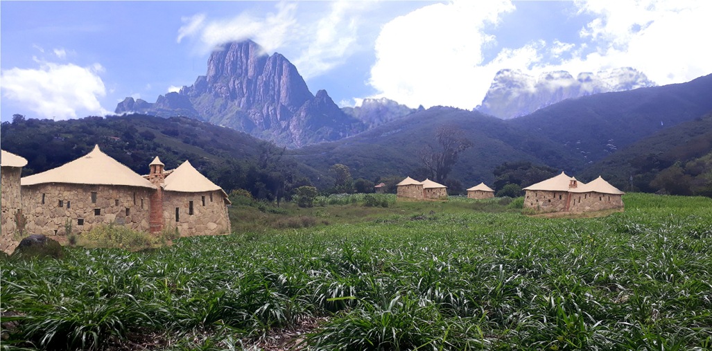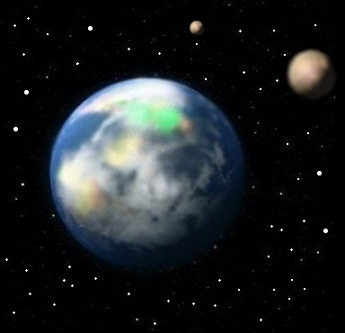 En la imagen de más abajo se puede observar la gigantesca meseta Mac Parr, de una altura de 5.400 metros y en el cielo, los dos satélites naturales de mi planeta. Esta majestuosa montaña está ubicada cerca de donde yo vivo y a veces subo a su cima acompañada de mi familia.