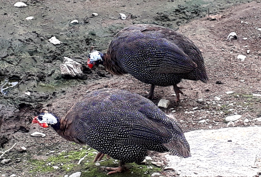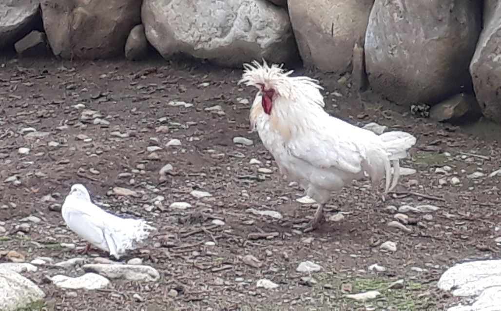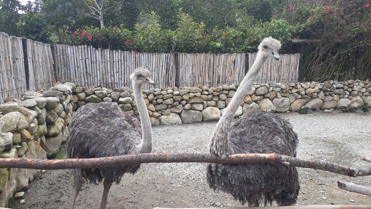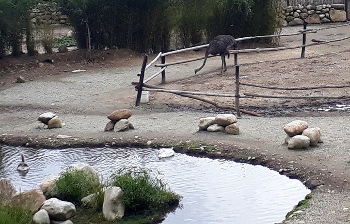 Luego decidimos movernos del sitio y después de caminar un corto trayecto, llegamos a un gran corral, es el área dedicada a las aves, es permitido entrar a este gran recinto para estar en contacto con estos animales. En este espacio hay diversas especies representantes de este grupo zoológico; patos, pavos, gansos y una gran variedad de gallinas y de palomas nos deleitaron con su hermoso plumaje y sus melodiosos cantos. Incluso hay varios avestruces (Struthio camelus) en el encierro.