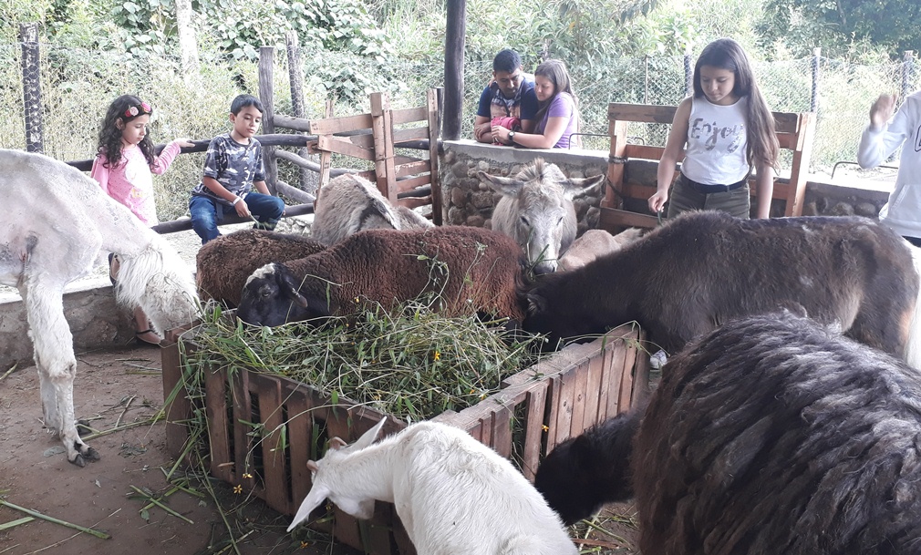 Cuando nosotros llegamos, era la hora de alimentar a estos animales y todos ellos se estaban dando un banquete de pasto y otros vegetales, que son la dieta básica de estos cuadrúpedos. Varios niños estaban reunidos allí viendo el banquete y aprovechando la ocasión para tocarlos. Allí estuvimos un rato compartiendo los alegres momentos propiciados por el festín.