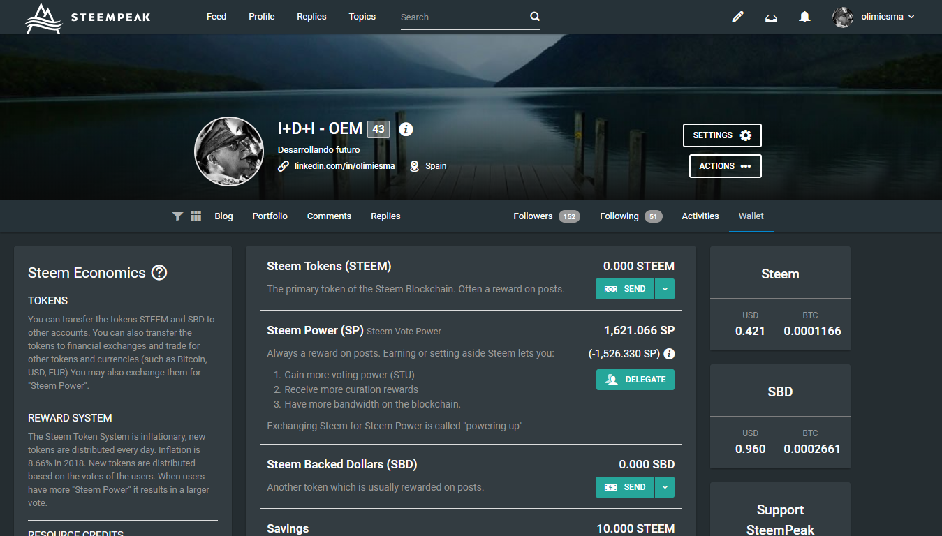 Como se puede observar en la captura de pantalla de arriba la interfaz es 100% compatible con mi escritorio de Windows 10; Es un entorno amigable, muy limpio y se nota preocupación por parte del desarrollo, aportando gran cantidad de información útil y verdaderamente intuitiva para el principiante y más aún para alguien con conocimientos amplios en la BlockChain de Steem. No obstante, como he dicho siempre "Todo se puede mejorar" y hacen falta cosillas, no estaría de más un sistema información avanzada implementado en SteemPeak, sin ánimo de copiar a SteemWolrd o SteemD, pero sí que estaría bien una fusión que permita una transparencia accesible desde un solo lugar "SteemPeak".