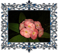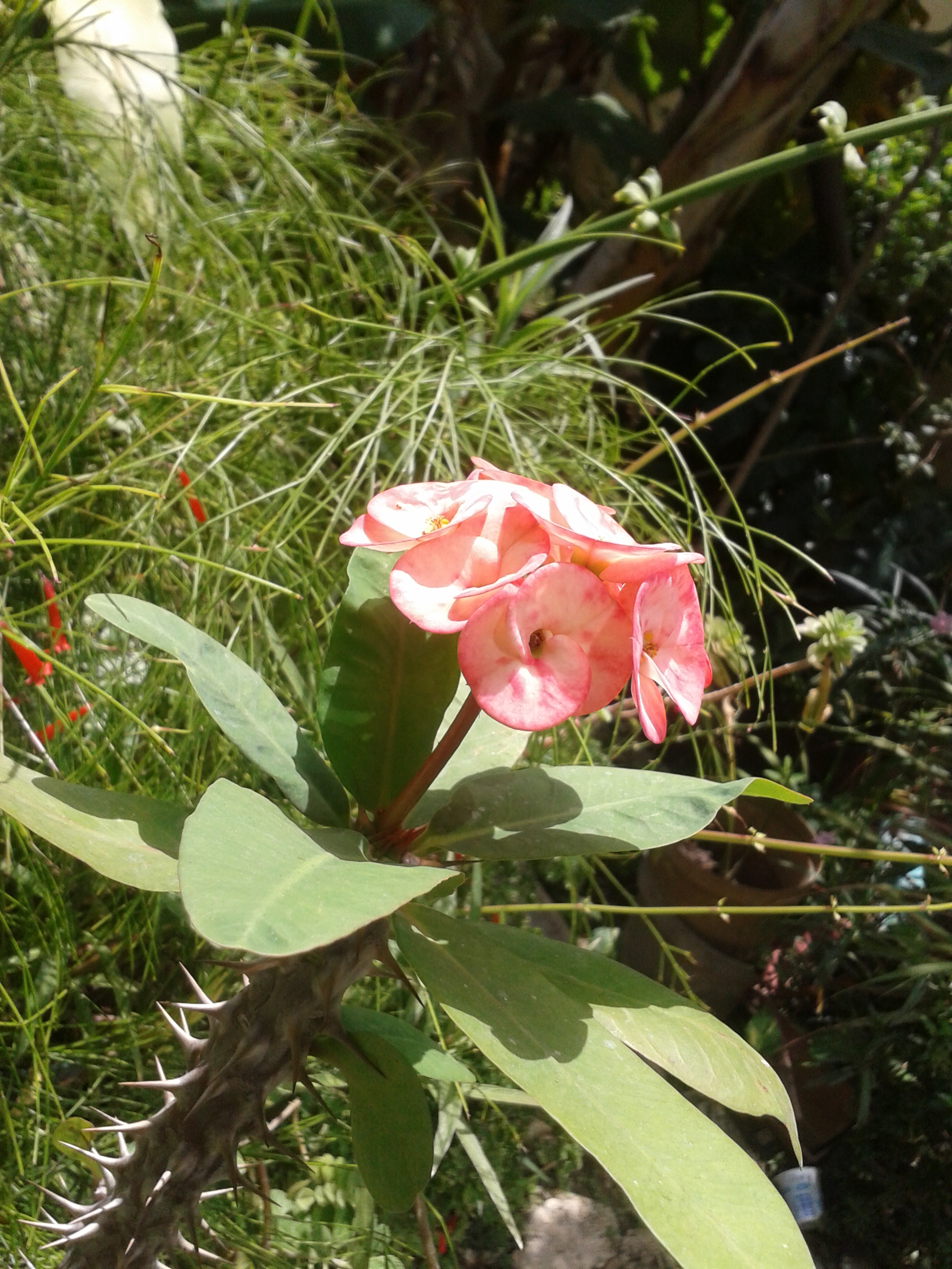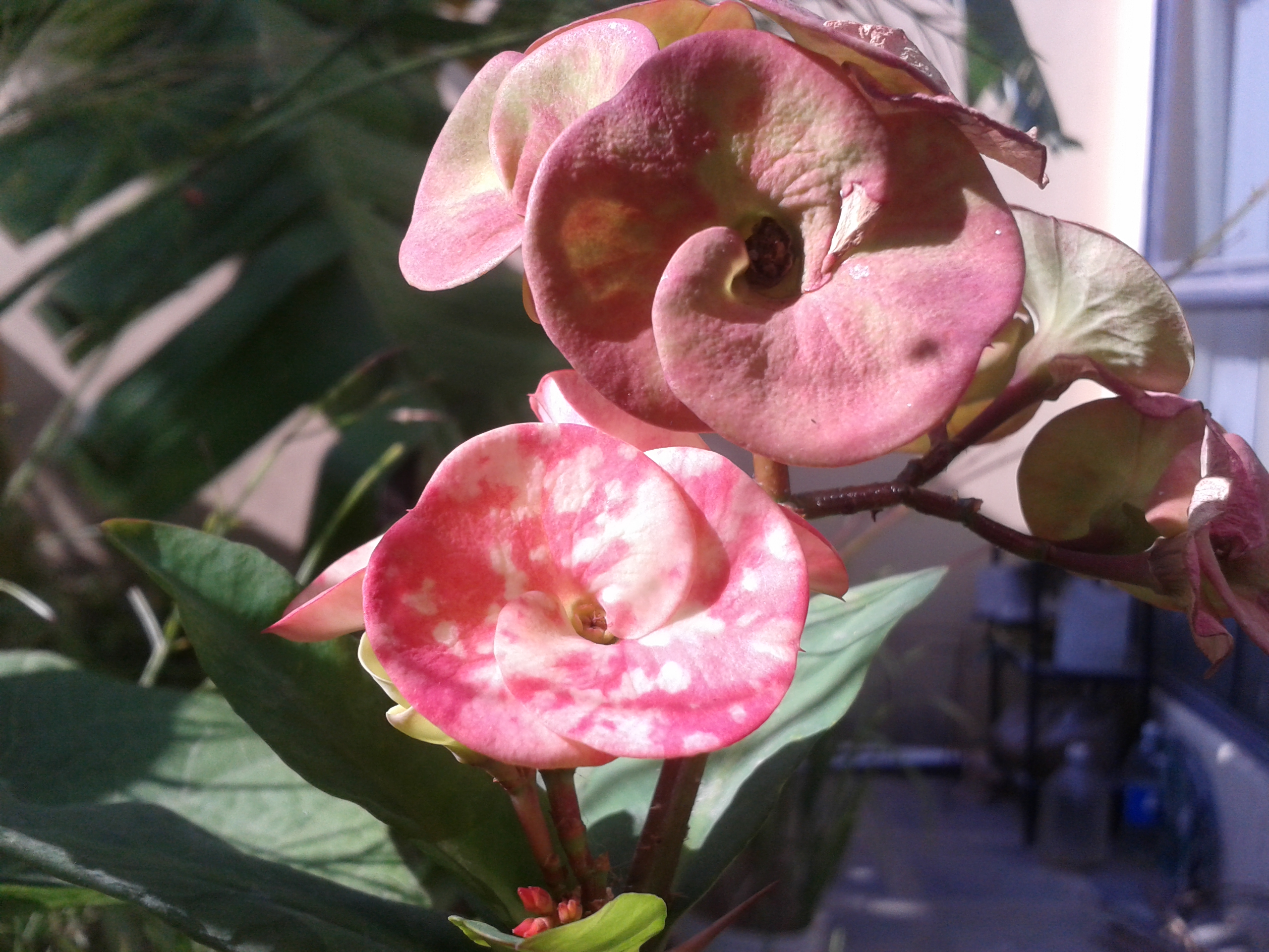 Las flores de la Corona de Cristo son muy pequeñas y se encuentran justo en el centro, alrededor y muy próximas a ellas, se encuentran las brácteas que son las que podemos confundir con la flor; la función principal de éstas es la protección de las flores. Suelen ser de color rojo, amarillo o rosadas, como la que tenemos en mi casa. Lo que más me gusta de esta planta es que florece casi todo el año.