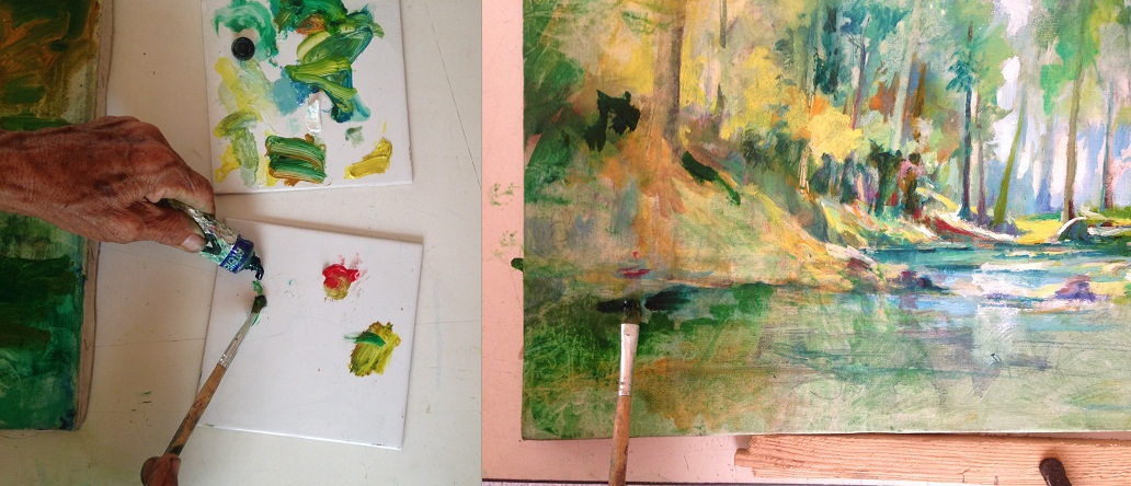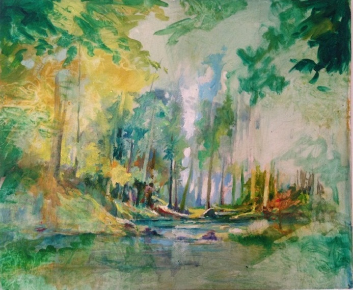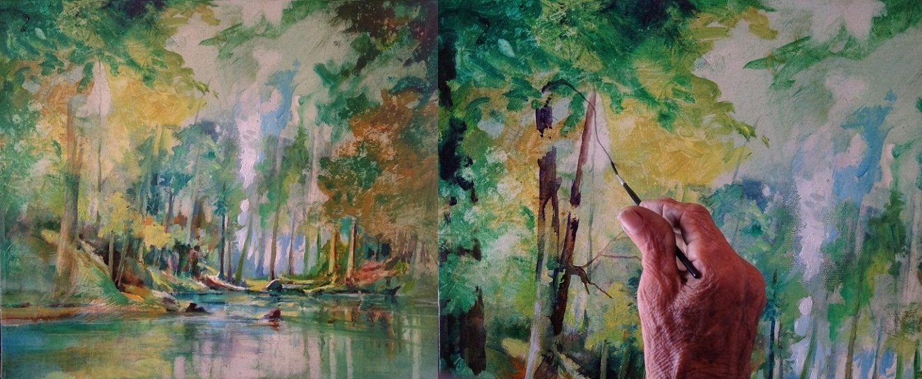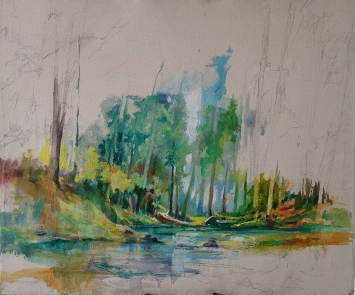 Ese es un titulo francés que más se acerca a la escenificación de este bosque, en español quiere decir al borde de una naciente de agua, realmente es un lago pero allí se forma unos reflejos y hay una interpretación muy mística y espiritual de la naturaleza. Pintura figurativa pero de una ejecución libre donde se utilizan muchísimos recursos y se hace una exposición absoluta de la creatividad. La obra elaborada en oleo sobre lienzo es tratada con veladuras y crea una atmosfera susceptible por la imaginación contenida en la técnica y la libertad de su ejecución comienza con unas manchas que ya llevan la intención final de la obra como se puede observar en esta toma.