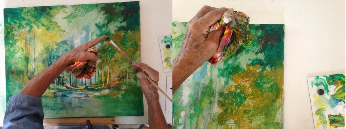 Esta técnica consiste en tener el pincel en una mano la derecha, impregnada de liquido y con la otra mano se hace pasar por un dedo de ella y va rociar pequeñas gotas que van a retirar la pintura que se le dio al follaje, enseguida una vez que el liquido ha tocado la tela, se dispara moviendo el pincel hacia la pintura tratando de hacer una especie de rociado a la tela, con un papel absorbente o una tela absolvente se retiran las gotas que cayeron sobre la tela y queda un orificio vacio, se repite nuevamente cargándolo con otro color en este caso amarillento y queda impreso esa maravilla que forma parte de las hojas.