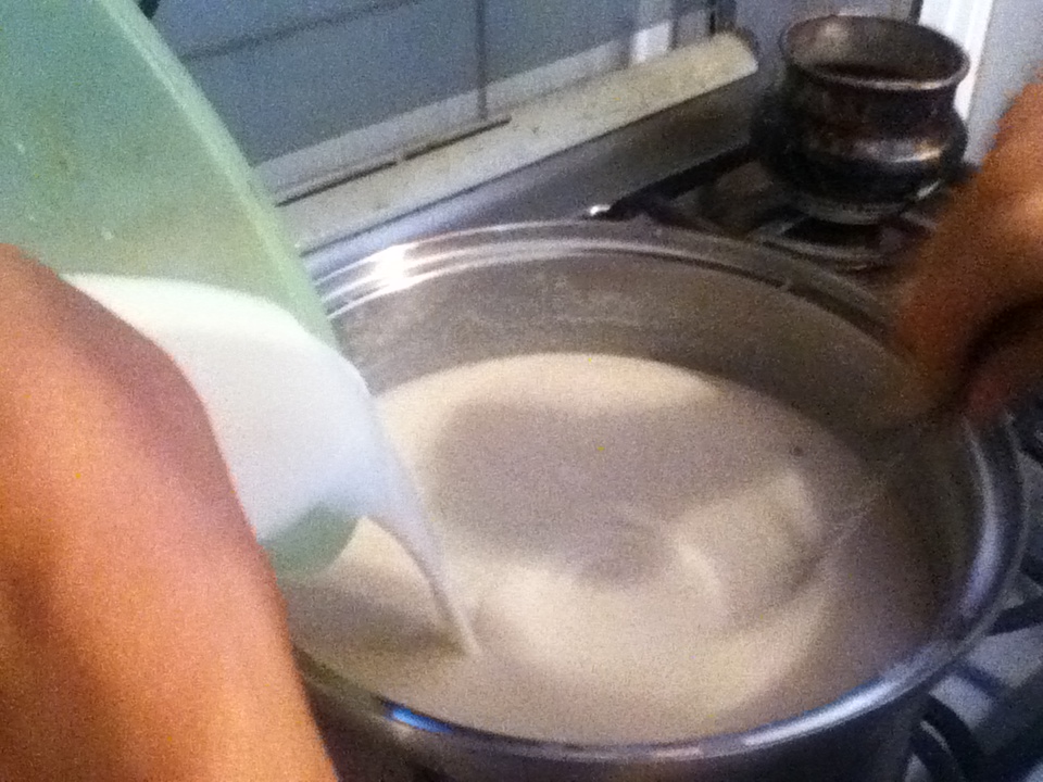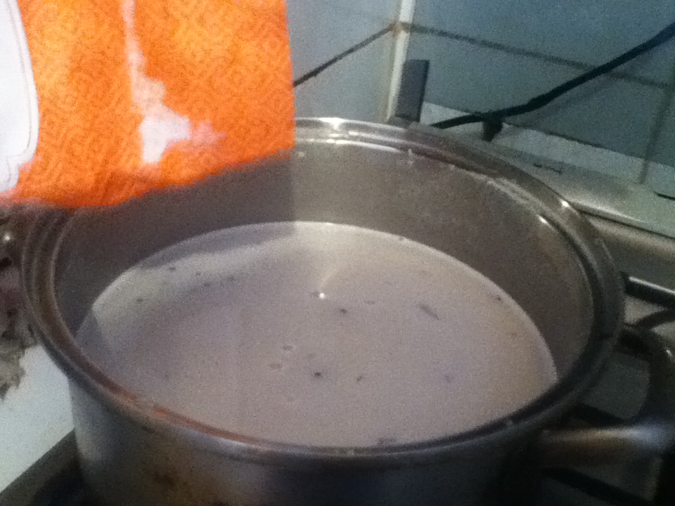 - Ya al fuego, revolviendo para que no se empelote, luego ir agregando la vainilla, los clavos de especie, el azucar, por ultimo la leche batida en 1 litro y medio de agua se bate la leche y se agrega por ultimo al alimento hirviendo.