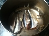 En una olla colocamos agua, sal, orégano, dos dientes de ajo y las sardinas, encendemos el fuego y lo procedemos a cocinar.