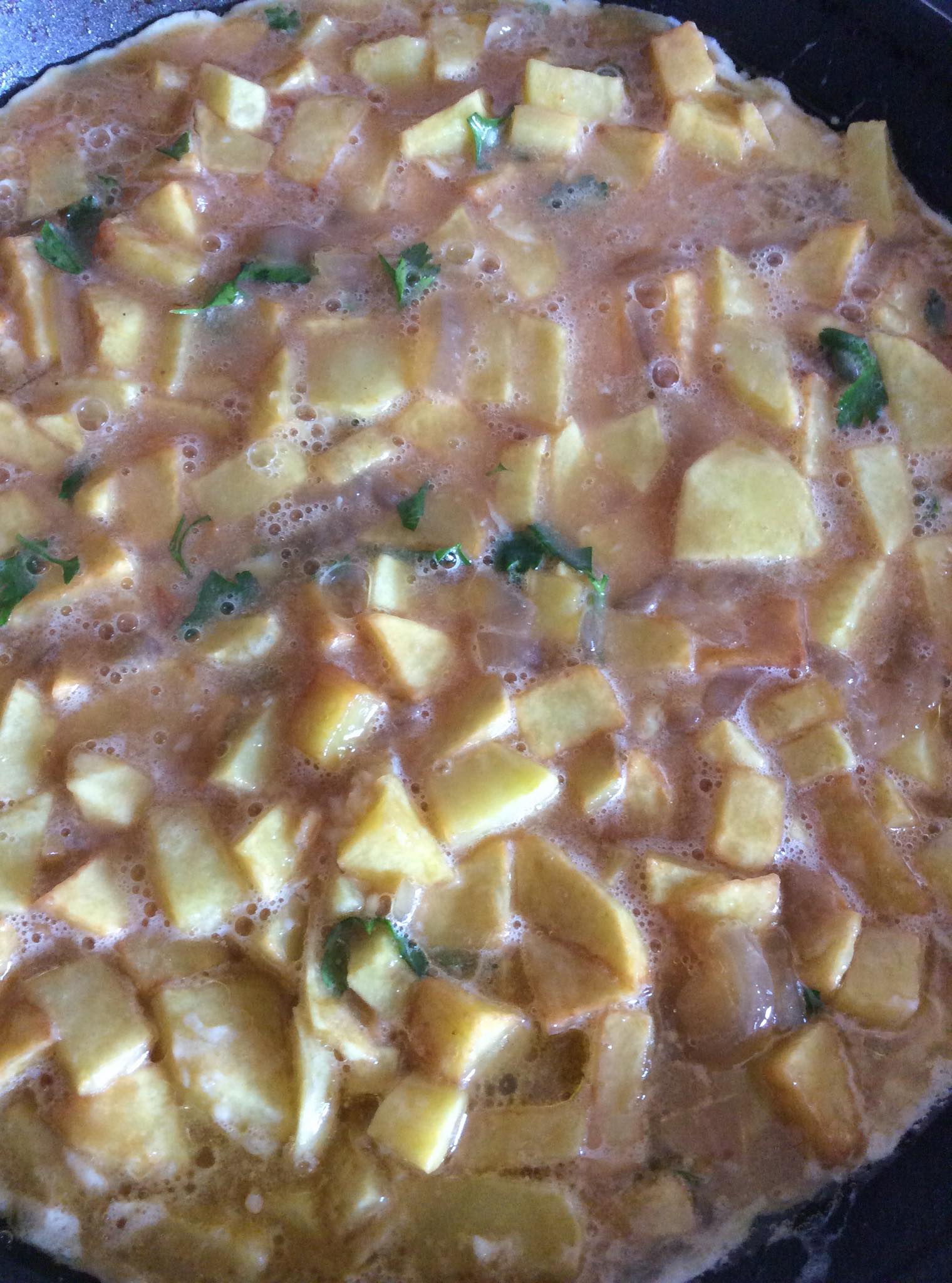 Lo principal cortar las patatas a taquitos , luego freirlo. Batir los huevos y añadirle cebolla caramelizada y sal , yo le echo un poco de perejil para darle un toque salvaje a mi tortilla.Ahora mezclamos todo muy bien.