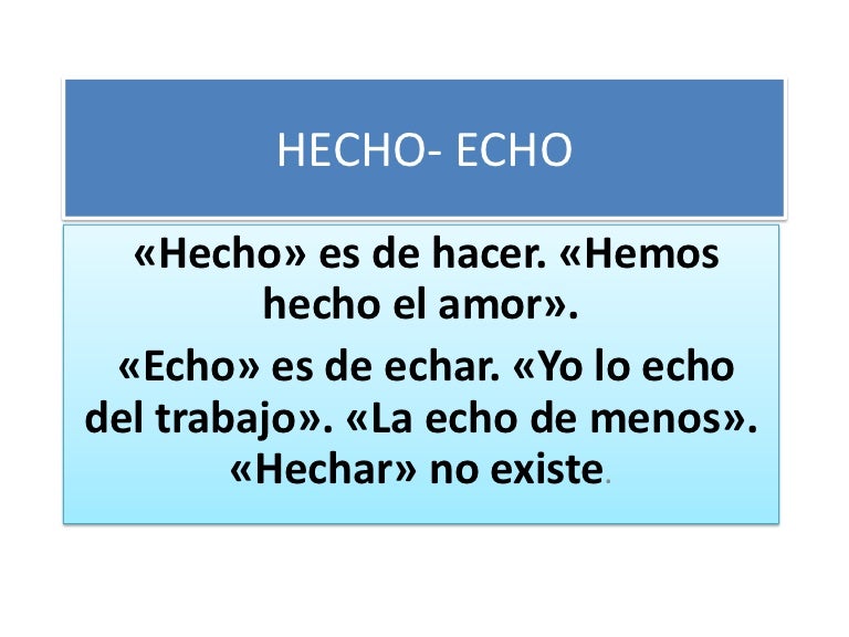 Otro caso que se confunde es el uso entre ECHAR o HECHAR. Como se puede observar una palabra lleva H al comienzo y la otra no. Al momento de hablar no hay problema porque la h es "muda" ( no se pronuncia) en Español, pero al escribirla... es cuando vemos los errores.