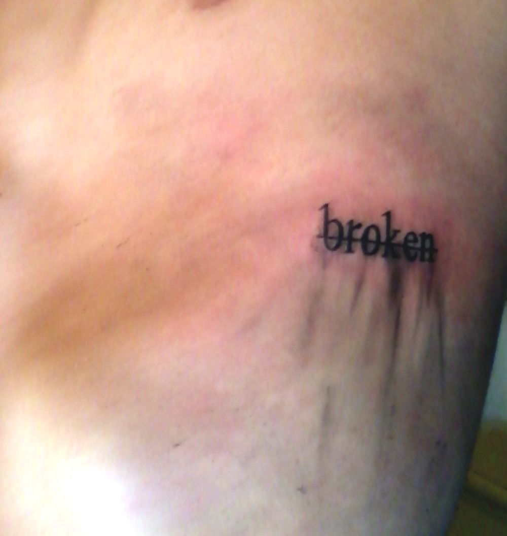 La frase broken tachada ubicada en mis costillas del lado izquierdo fue mi elección para el primero de tantos tatuajes que deseo hacerme, y no pude perder la oportunidad de mostrarles este pequeñísimo pero significativo cambio en mi cuerpo, e incluyendo otro cambio que también hice un día anterior totalmente inesperado.