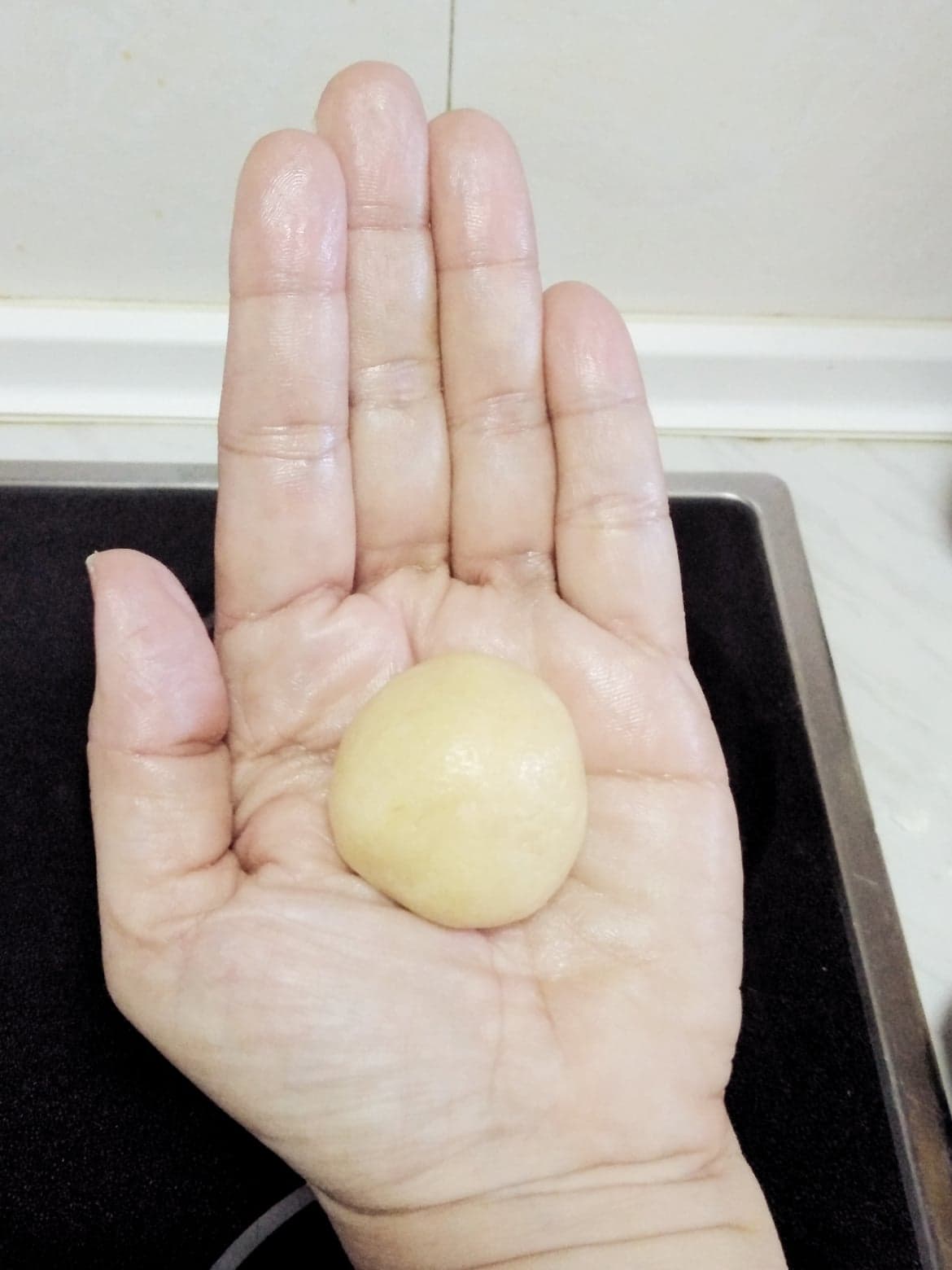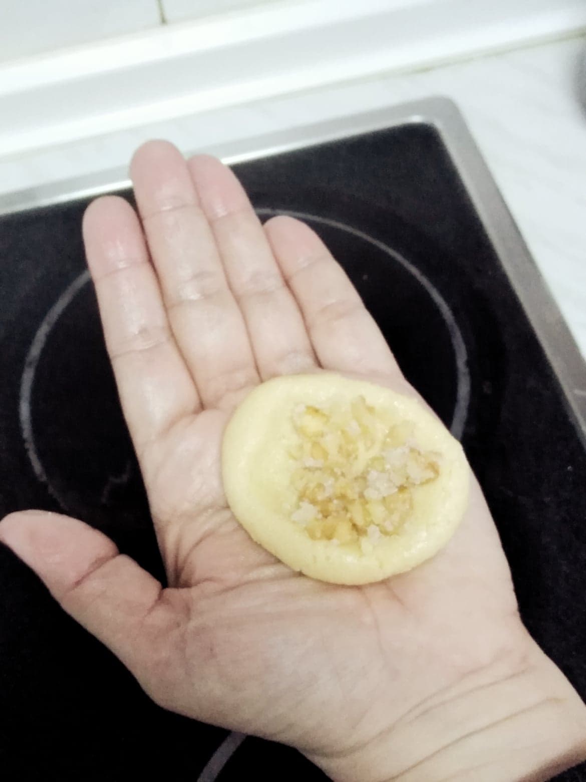 La aplanas en el dorso de tu mano y pones una cucharadita del relleno y luego la vuelves a cerrar y dar forma de bolita, como al principio.