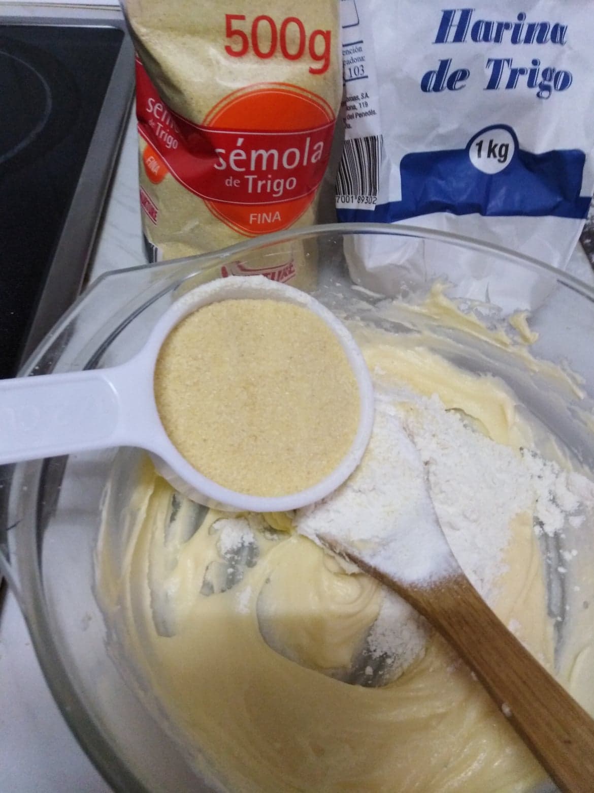 Mezclar ahora la sémola, harina y polvo.