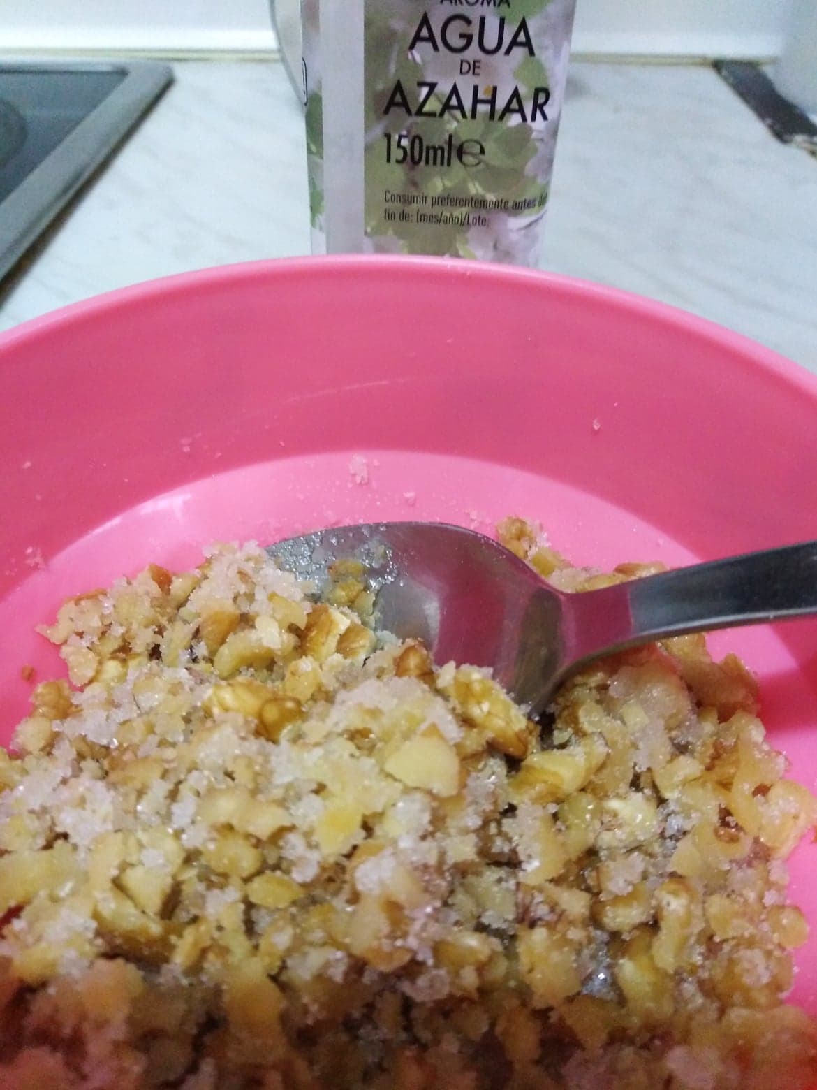 Ahora las unimos al azúcar y agua de azahar, removiendo, dejamos reposar.