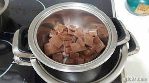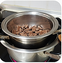 Para ello cogemos una olla mediana llena de agua hasta la mitad y una olla más pequeña que la pondremos dentro de esta. En la olla pequeña echaremos el chocolate que queremos fundir. Lo ponemos a fuego medio y removemos de vez en cuando hasta que quede una crema homogénea.En otra cazuela echamos el almíbar que preparamos con anterioridad.
