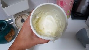Esta capa vamos a cubrirla con nata, así que cogemos el bote que dejamos en la nevera y montamos toda la nata que queramos. Yo como lo hice con la minipimer eché lo que entraba en su vaso.
