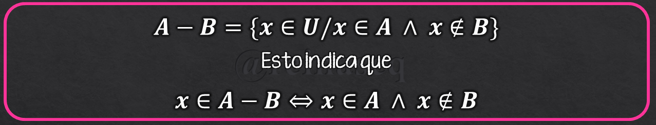 Ya refiriéndonos a la definición matemática tendríamos lo siguiente: Sean A y B dos conjuntos cualesquiera subconjuntos del Conjunto Universal, se define su diferencia como el conjuntos formado por todos los elementos del universo tales que éstos pertenecen al primer conjunto pero no pertenecen al segundo conjuntos. Simbólicamente se tiene