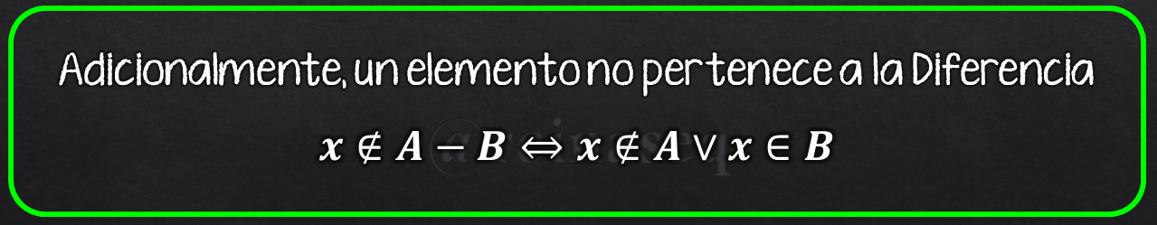 De la misma manera en la cual es posible precisar la condición que caracteriza los elementos que pertenecen al conjunto diferencia también es posible identificar la cualidad de no pertenencia, esto es, que un elemento cualquiera no estará en el conjunto A-B si no pertenece al primer conjunto o pertenece al segundo, tal como se muestra algebraicamente en la siguiente imagen