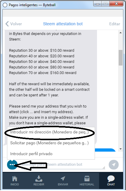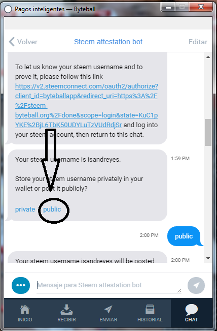 Paso 9: Nuevamente en el wallet de byteball, hagan público su user. Esto sirve para que cuando les envíen dinero, se los envíen con su user de steemit.