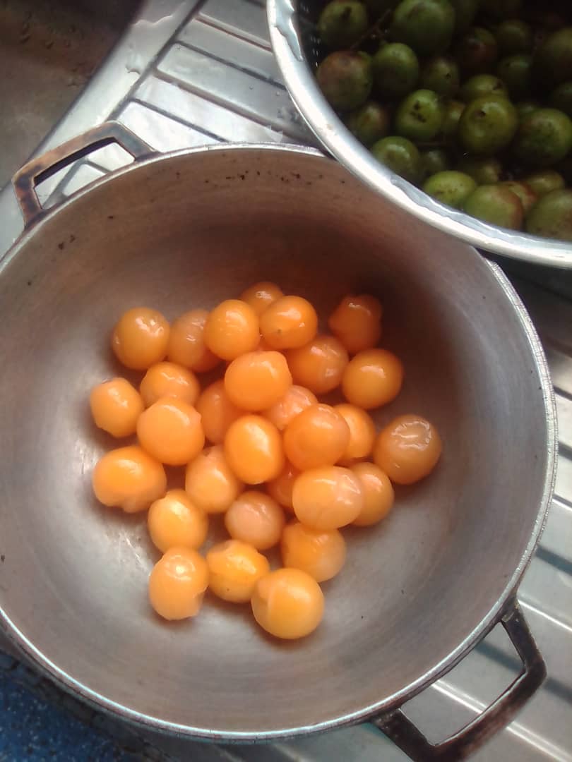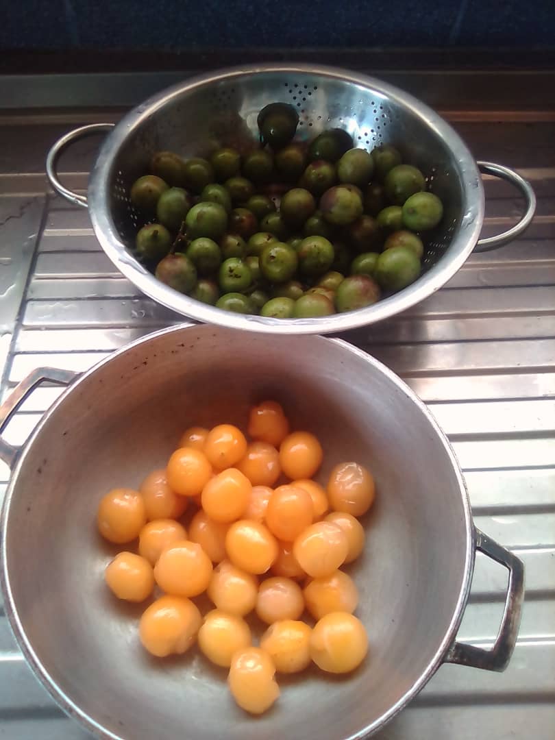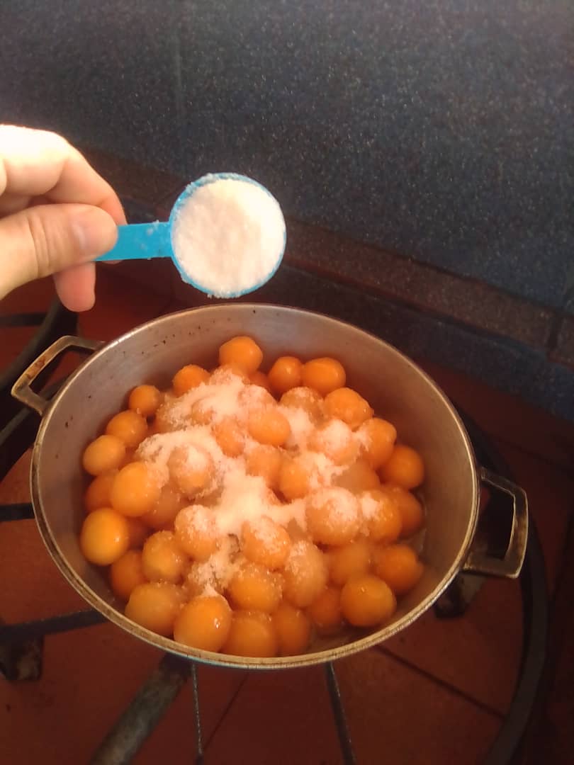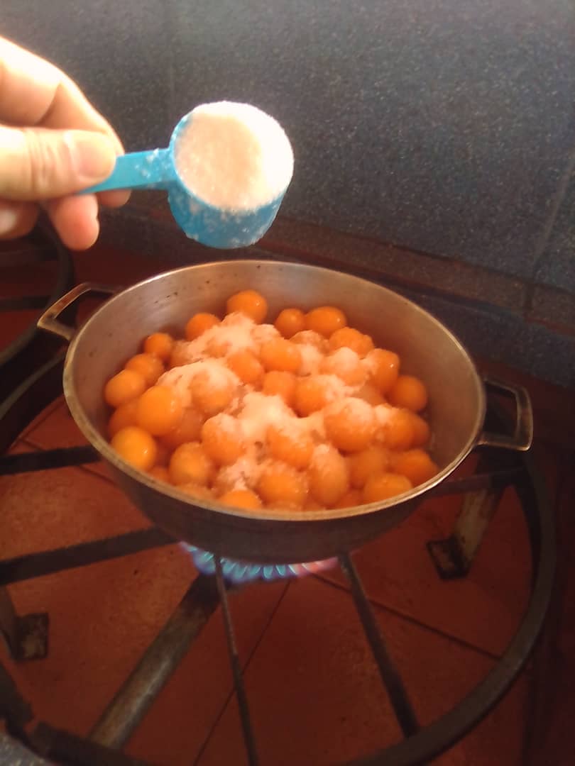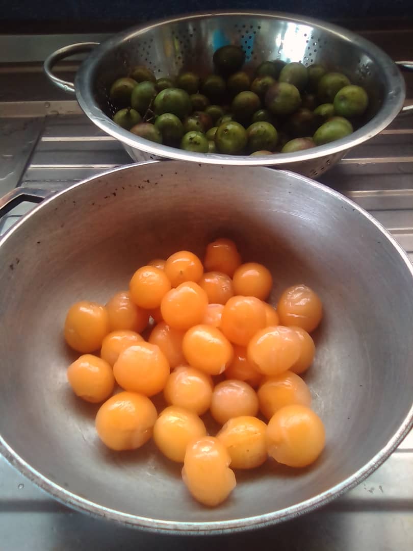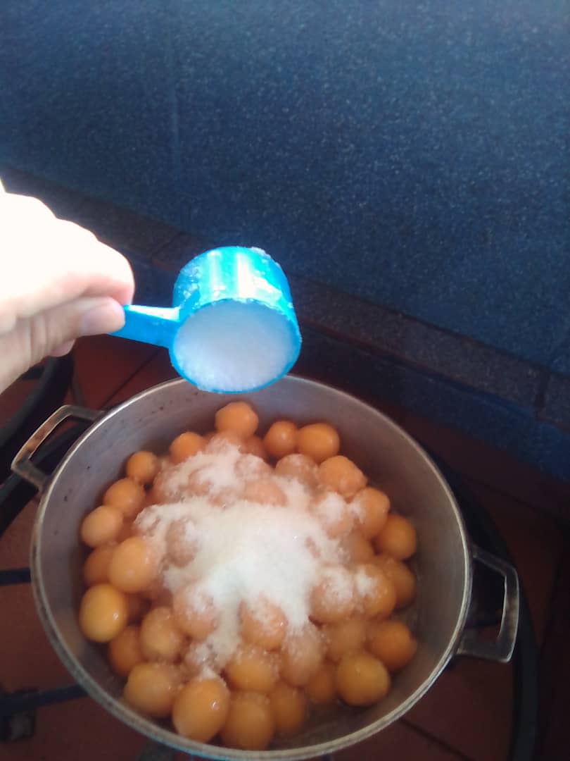 Cuando ya hemos lavado bien, procedemos a quitar la concha de la fruta y la vamos colocando en un caldero.