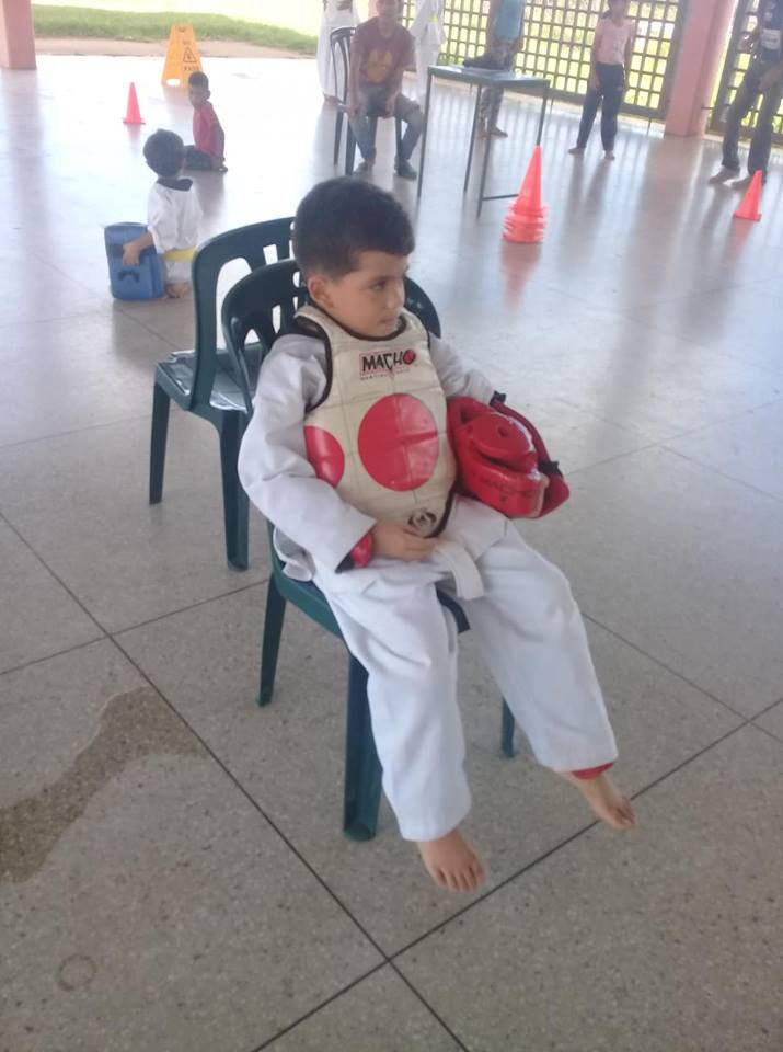 Ahora les contare de su primera competencia, no fue nada facil para el pero al principio estaba bastante concentrado esquivando las patadas del contricante y el marcando todos los puntos posibles ganando asi la primera ronda, en la segunda ronda recibio golpes que el no se esperaba y tuvo una caida fuerte de rodillas al piso, alli en ese justo momento se descontrolo diciendole al otro niño una groceria y poniendose a llorar, tuvieron que calmarlo y pedirle se concentrara de nuevo porque si se retiraba perdia la pelea, se calmo y regreso asi al terminar volvio a ganar llevandose su medalla de primer lugar y haciendome gratamente feliz por notar toda su emocion y verlo emocionado