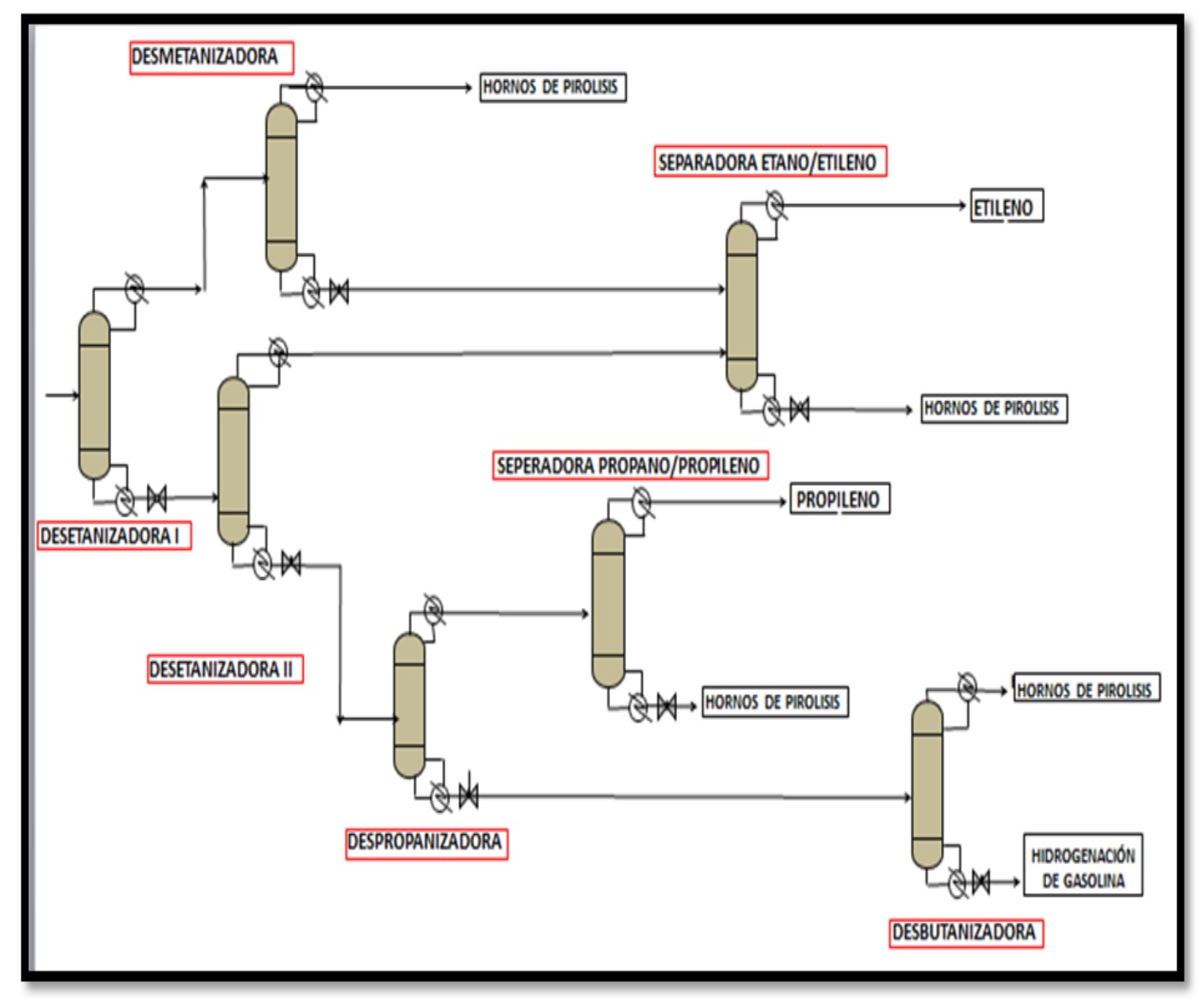 Figura 3. Esquema del tren de fraccionamiento que se puede encontrar en una planta de olefinas.