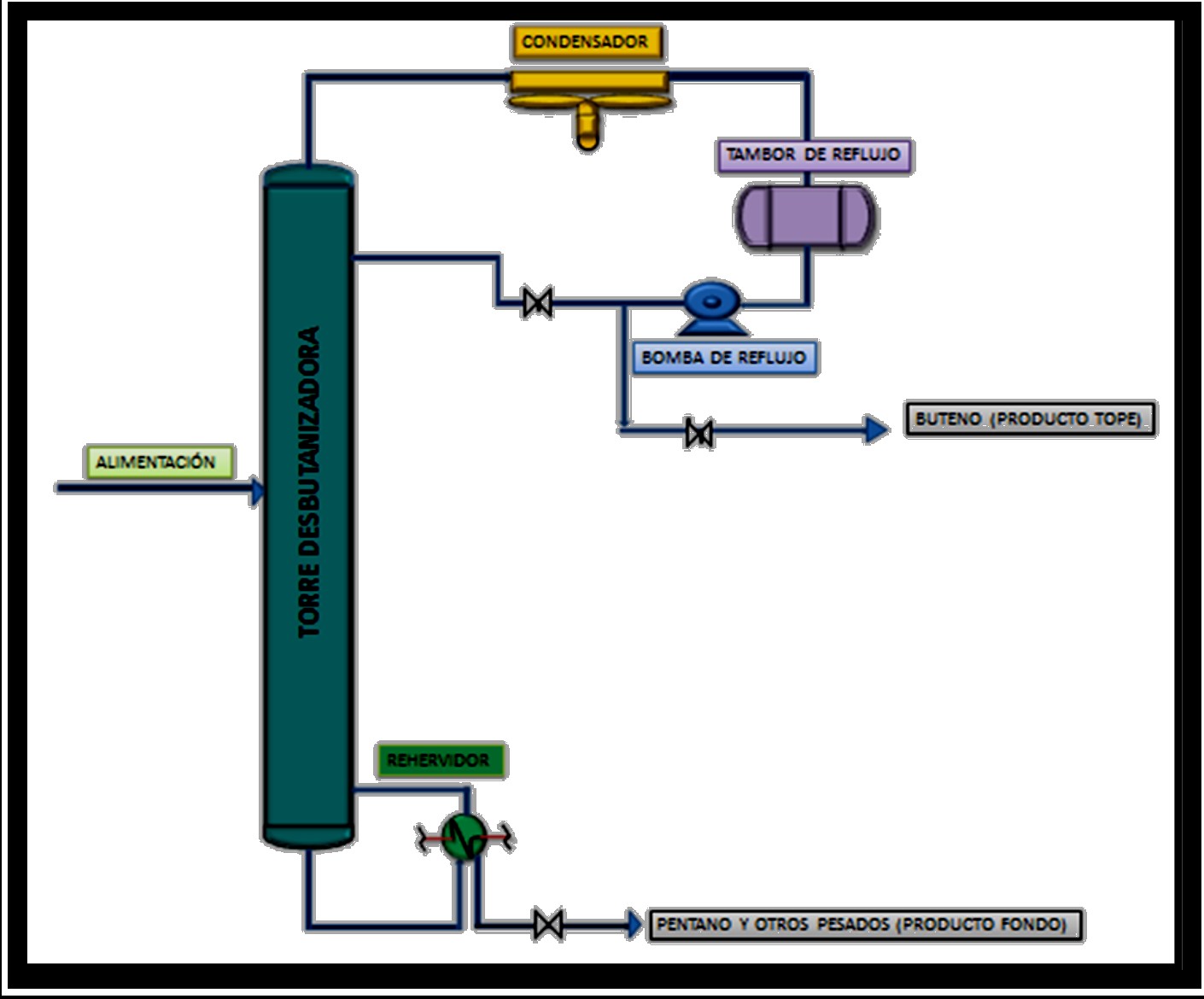 De estas ideas expuestas, es necesario acentuar la descripción del proceso operacional de separación en las columnas desbutanizadoras. En primer plano, como alimentación a estas columnas generalmente entra una mezcla conformada por butano y pesados (C5,C6,C7) donde con frecuencia se tiende a suministrar calor a través del vapor generado y controlado por una cascada de temperatura y flujo, por un rehervidor que funciona para poder producir los diferentes puntos de ebullición que proporcionan la separación de los diferentes componentes entre la cantidad determinada de platos que pudieran existir en este tipo de columnas.