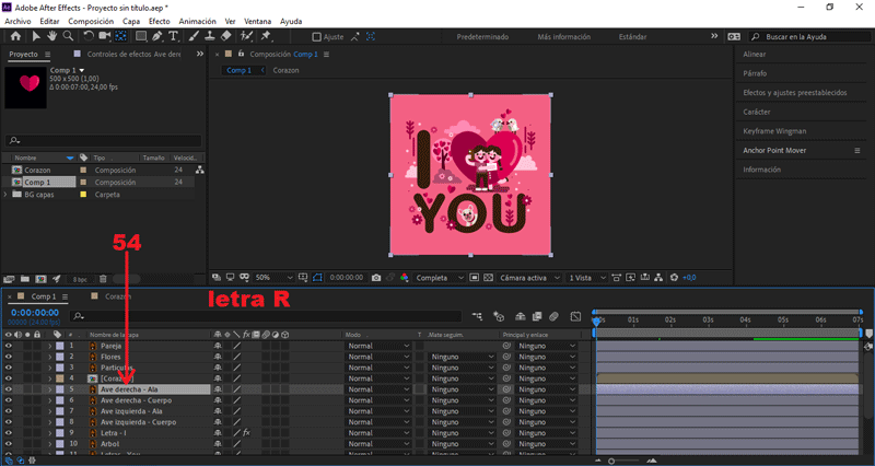 Seleccionamos la capa «Ave derecha - Ala», presionamos la letra "R".