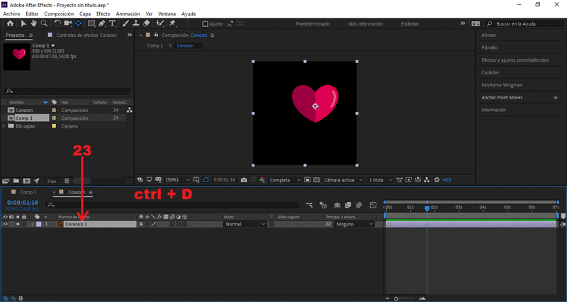 Teniendo seleccionada la capa «Corazón 1», presionamos ctrl + D.