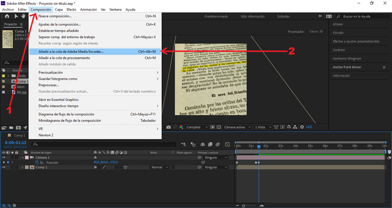 Presionamos Composición/Añadir a cola de Adobe Media Encoder...