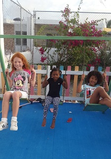 Juega con nuevas amiguitas en el parque que de su casa cerca está.