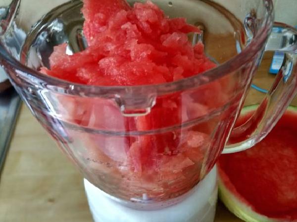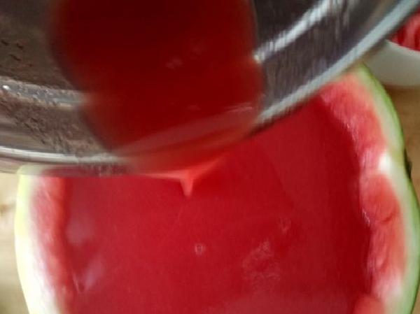 • Se mezcla el jugo de la patilla con la gelatina y se remueve bien. Luego se le agrega el jugo de medio limón y se continúa removiendo.