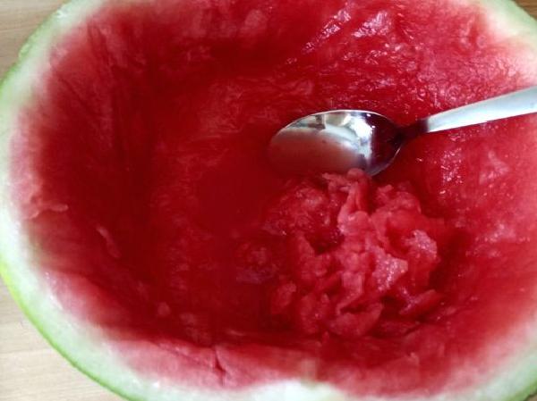 • Luego se vacía la patilla con la ayuda de una cuchara, tratando de sacar toda su pulpa. Después esta pulpa se agrega dentro de la licuadora. Dejando su concha lo más limpia posible. Es importante resaltar que antes de realizar todo el procedimiento se deben retirar todas las semillas de la fruta, para que el resultado final sea una gelatina lisa, suave y homogénea.