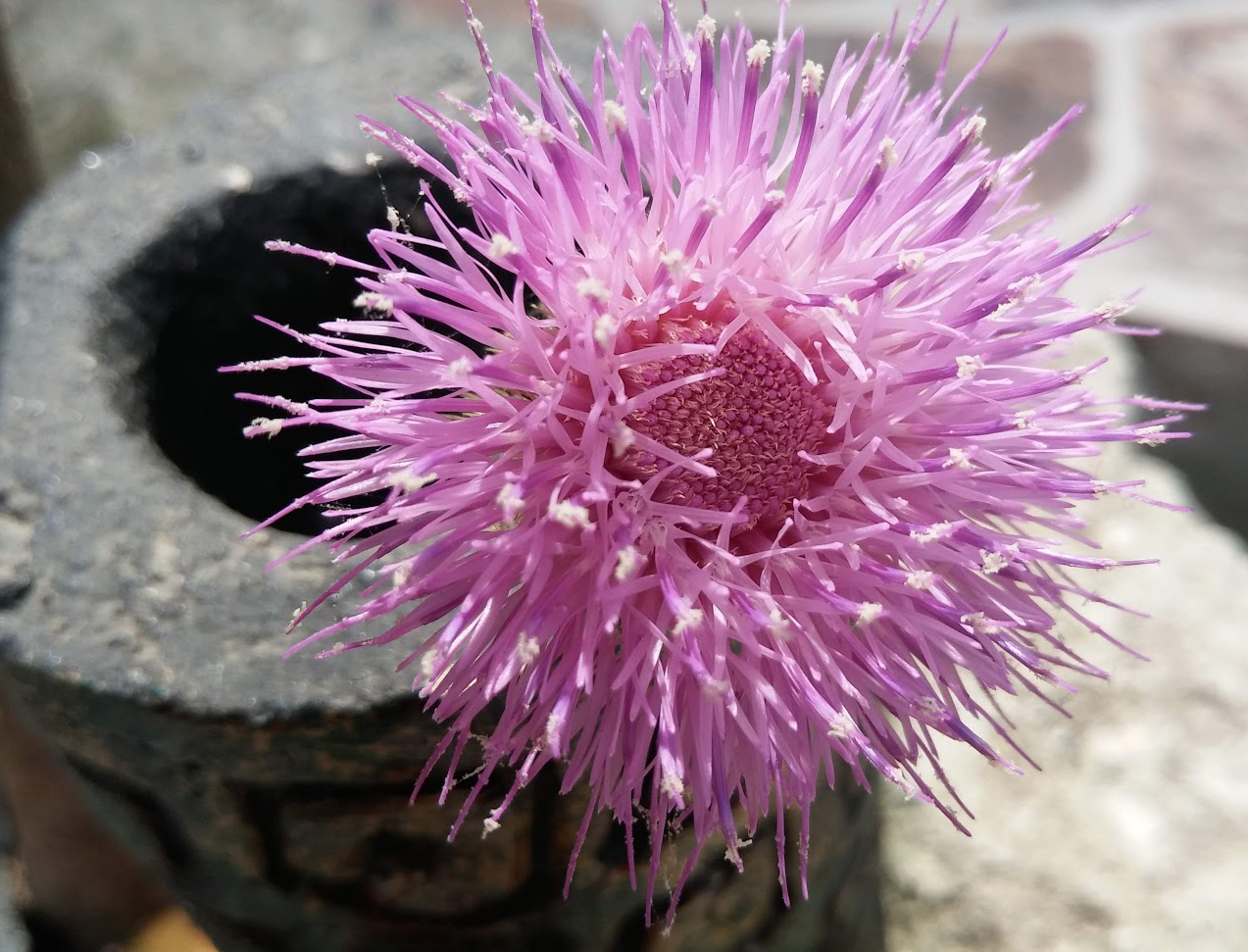 El contraste entre los colores vivos de las flores con la textura del suelo