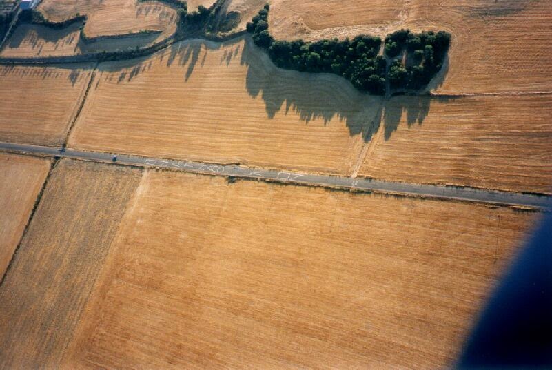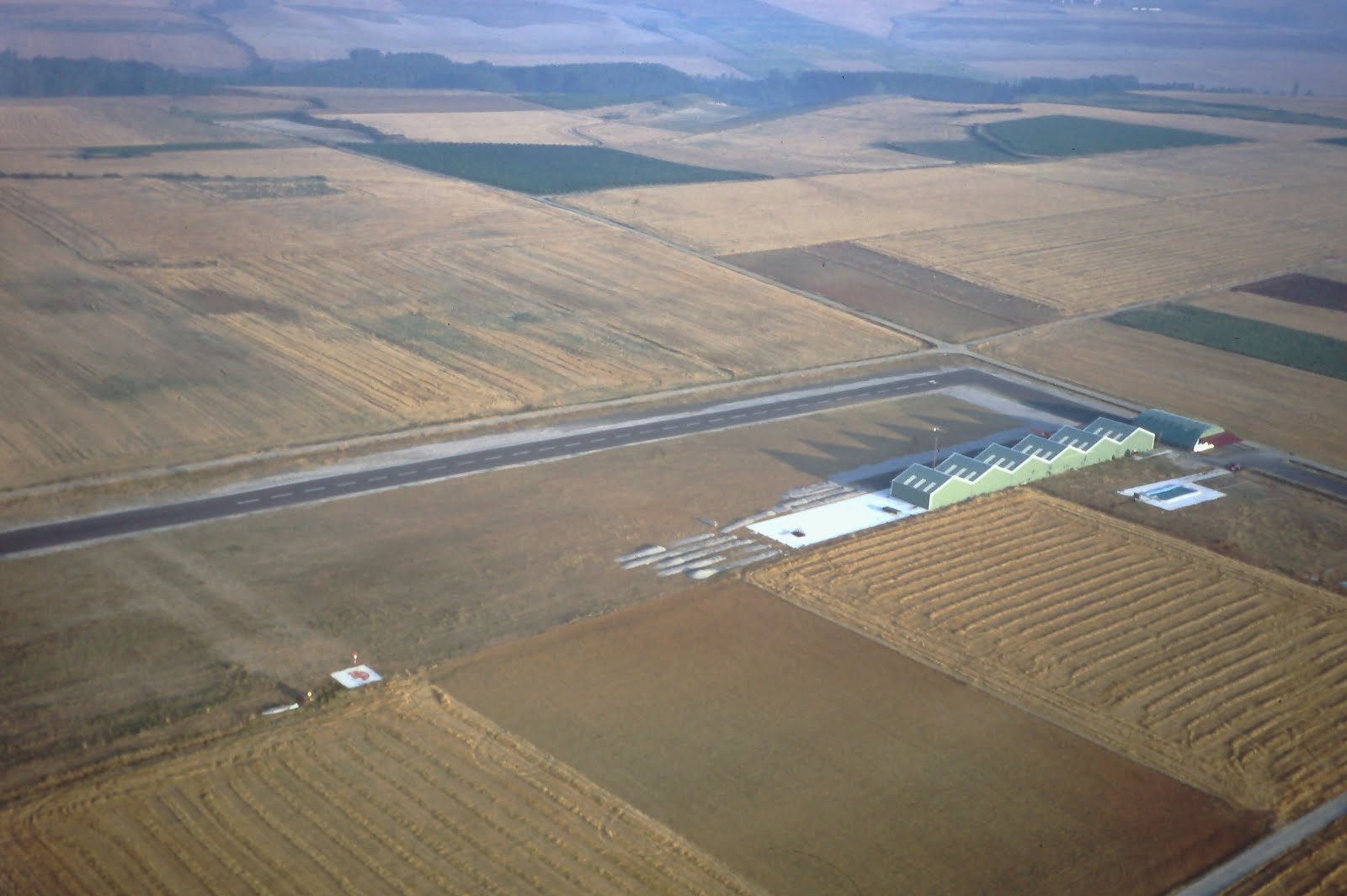 El Aeródromo de Villanueva de Gállego, en Zaragoza, fotografiado mientras realizo el tramo de viento en cola para el aterrizaje, afortunadamente se aprecia movimiento allí abajo, así no tendré que recorrer a pie los más de tres Km de ida hasta la gasolinera, la vuelta suele ser más fácil pues siempre encuentras a alguien amable que te acerque, con las garrafas llenas y pesadas ,de regreso al aeródromo.