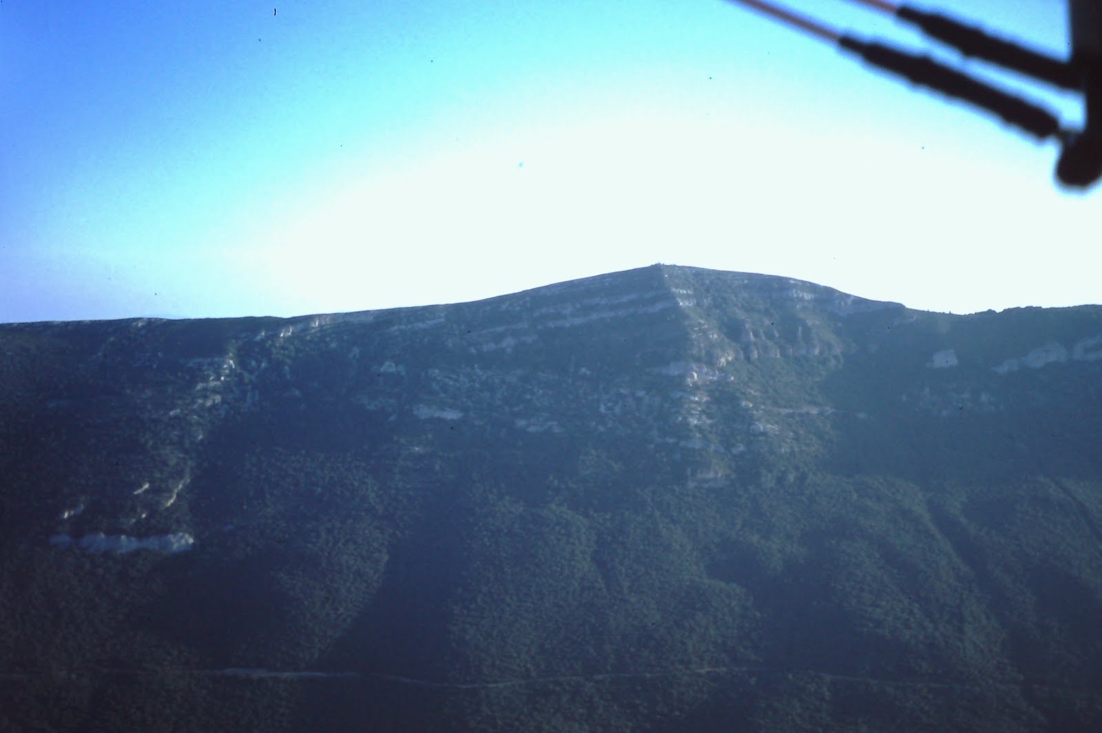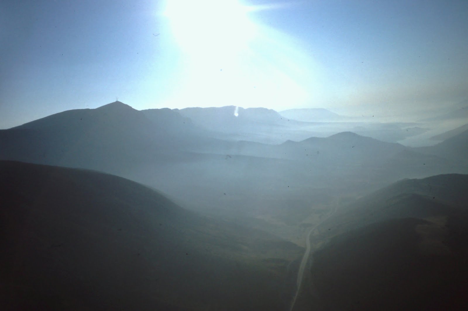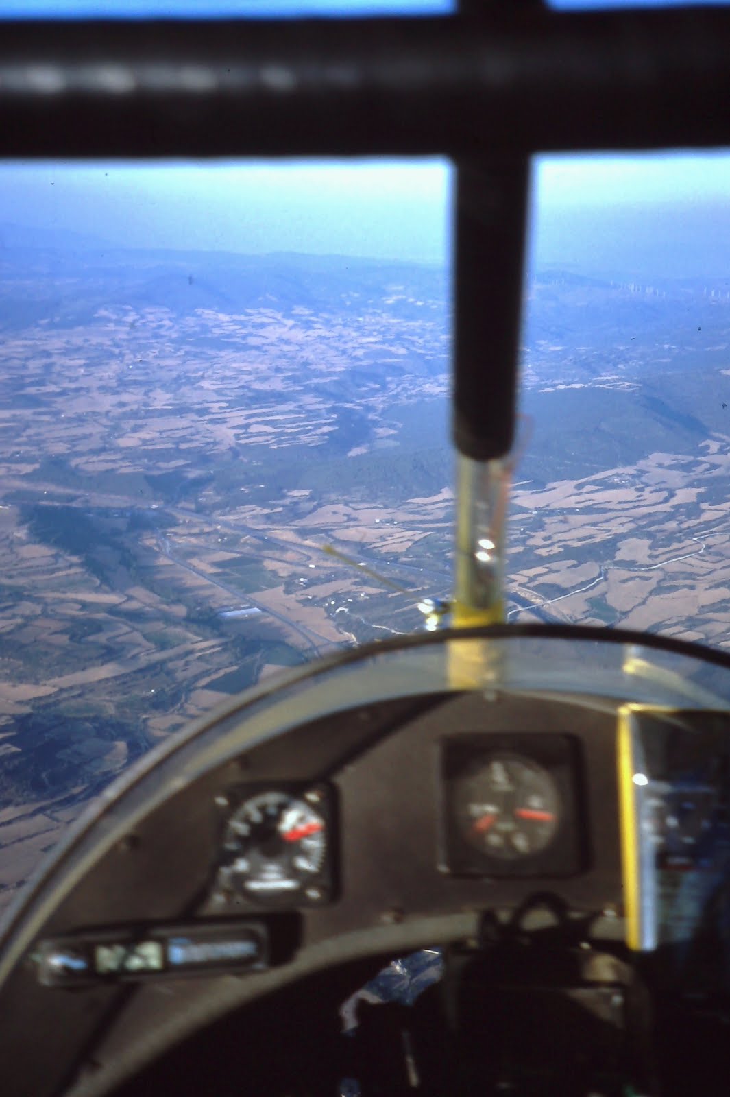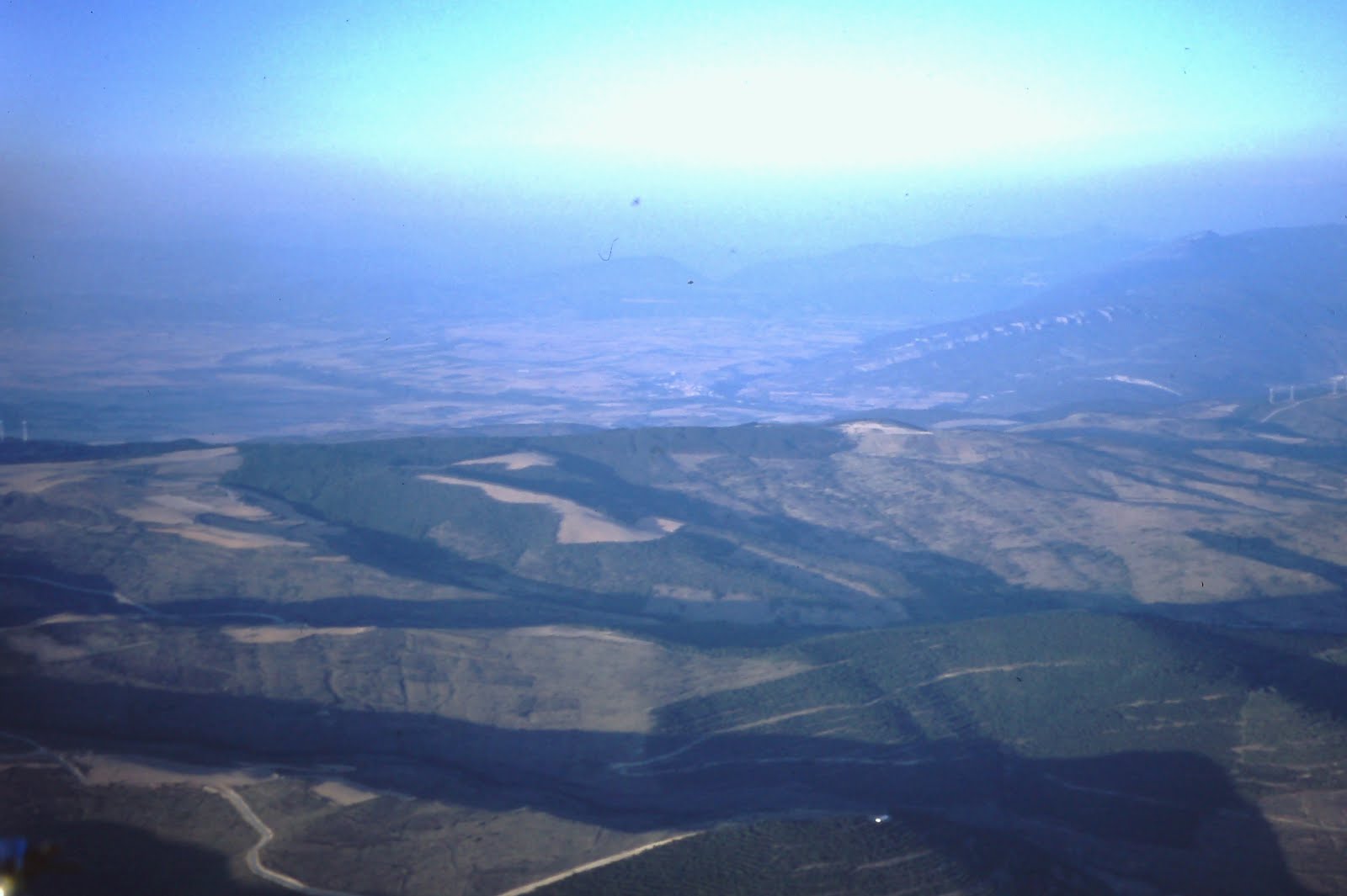 Después de repostar gracias a Félix, en el mismo Campo, despego de nuevo con destino a Tudela, Navarra, pero no puedo tomar rumbo "a derecho" o "todo tieso" como dicen por allí algunos, ya que esto implica volar justo sobre el Campo de Tiro de Artillería que tiene por allí el Ejercito ( área peligrosa LED 70A),así que me desvío al NorOeste, directo al monte San Esteban, buen punto de referencia ya que tiene una estación de Radares en su cima. Comienza la turbulencia y un fenómeno muy curioso, hay una estrecha franja de visibilidad ilimitada entre dos capas de calima,los montes que se ven en ella son los Pirineos, al Norte, que es de donde vengo.